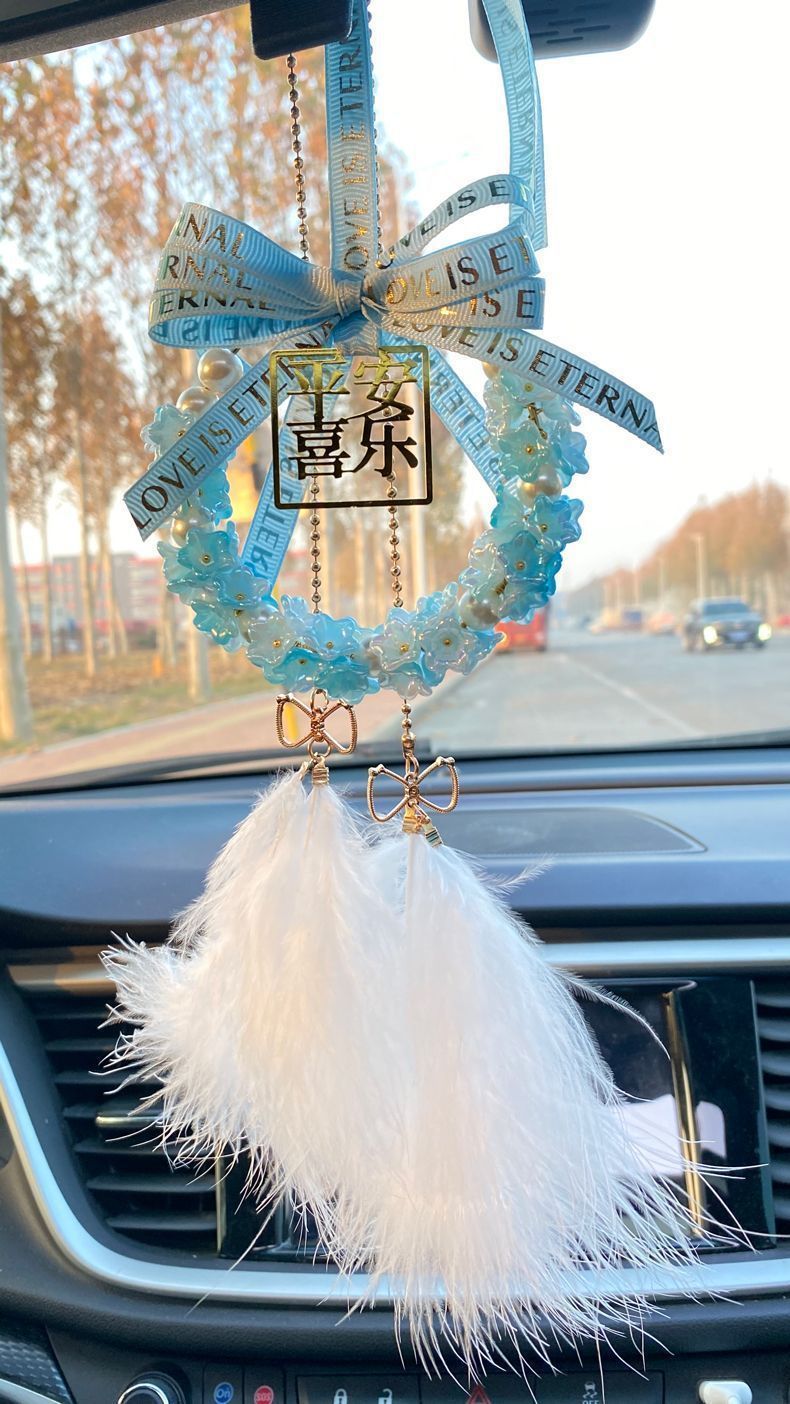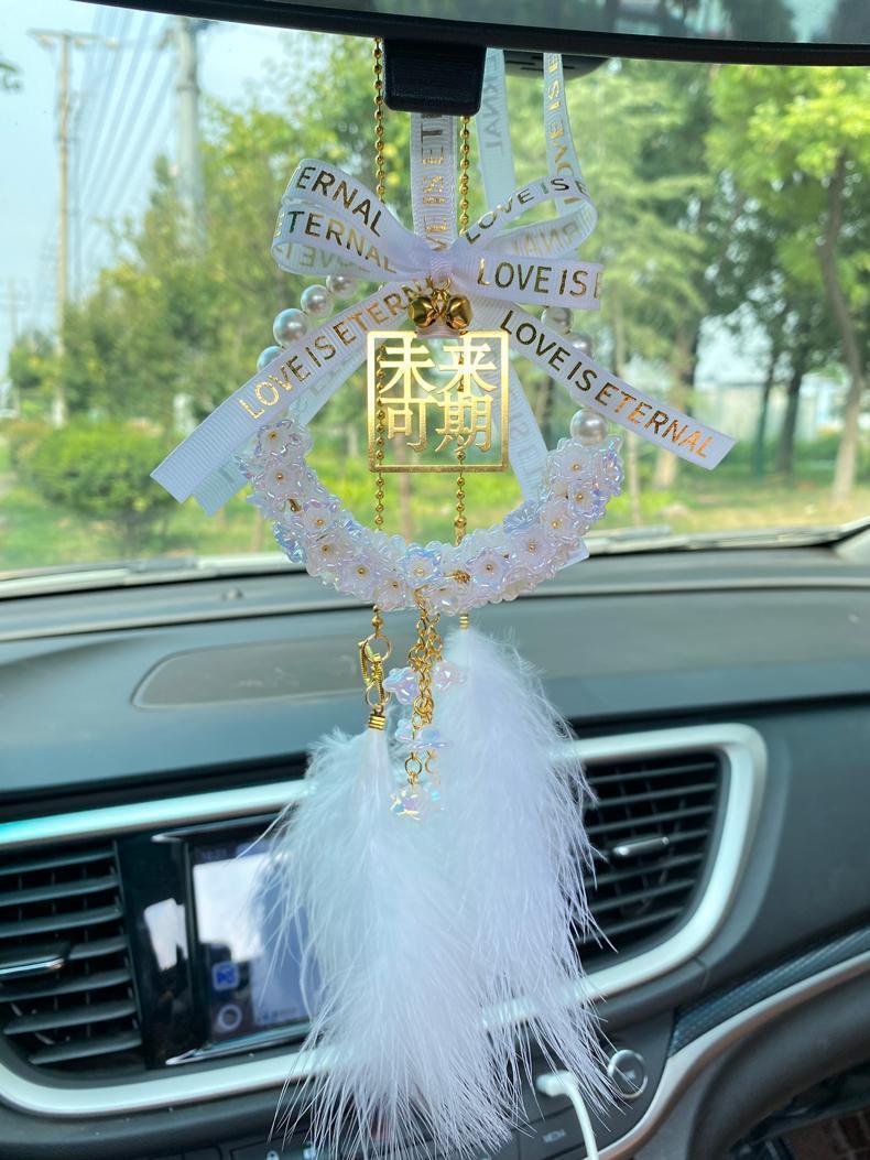 【車の好物】車内の羽の仙気のふわふわした雰囲気感の蝶結びの羽のバックミラーのペンダント