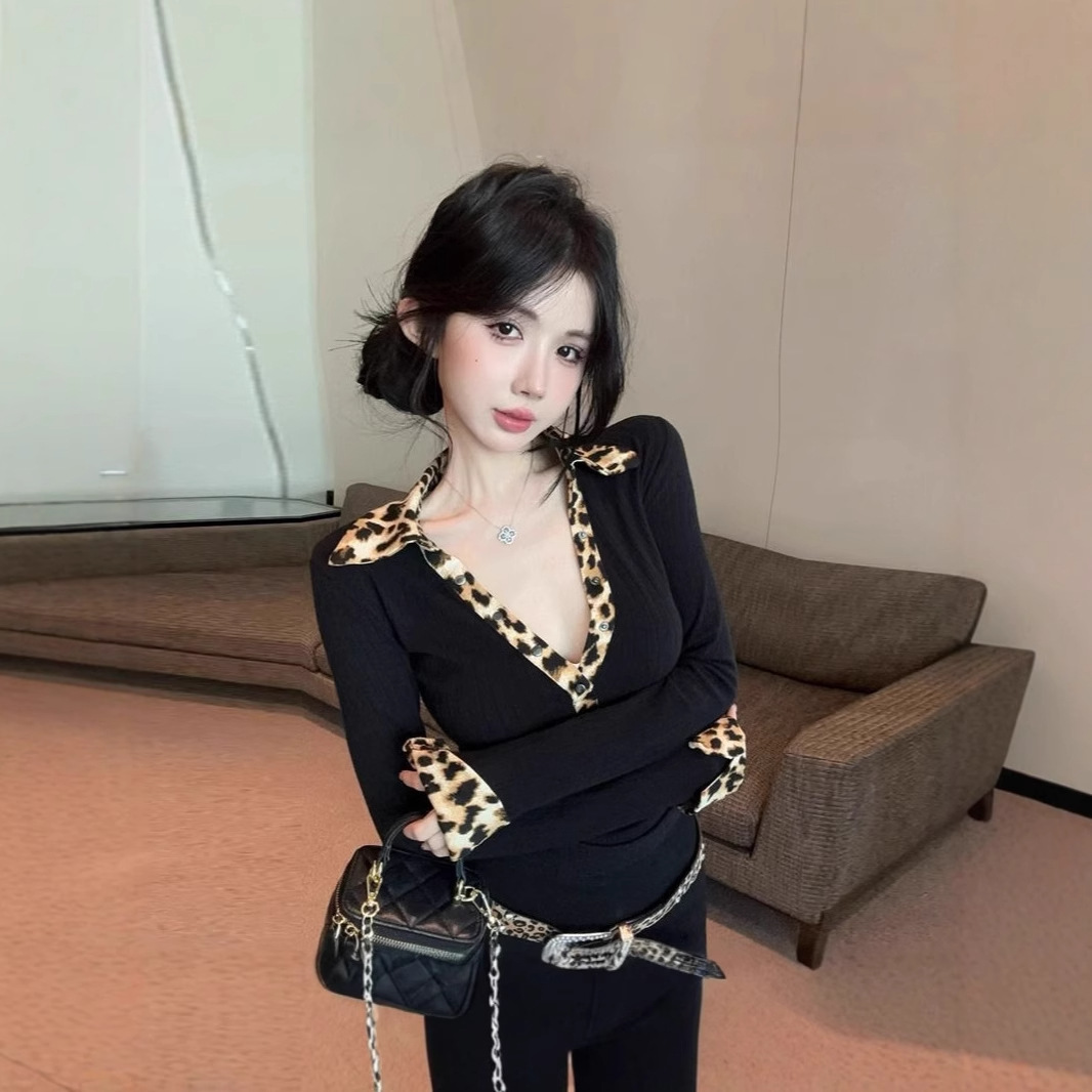 【工場現物】ファッションデザイン感豹紋ステッチpolo襟深v tシャツ修身百合小衆上着潮