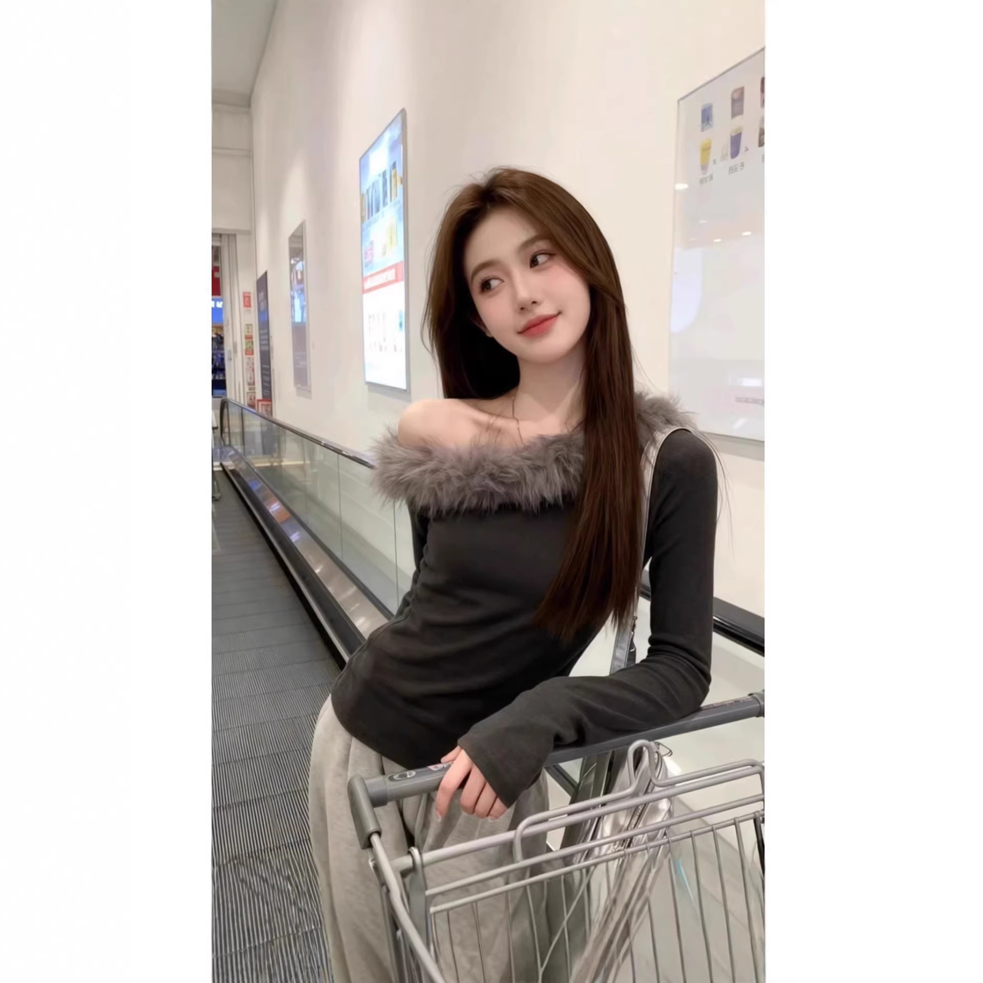【工厂现货】螺纹德绒灰色斜肩毛领t恤女秋冬纯欲露肩打底衫上衣
