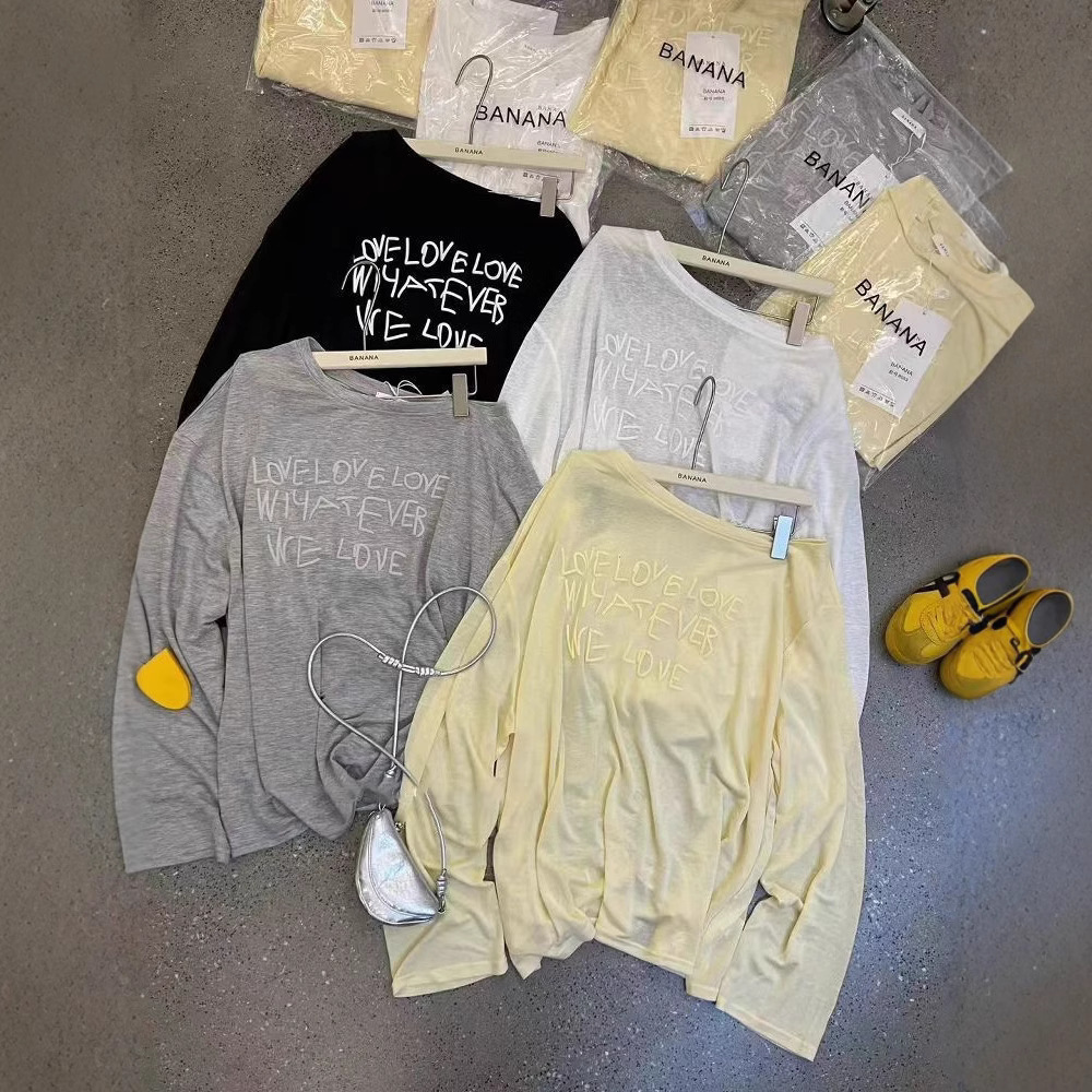 【工場在庫あり】テンセルリブサマーフォームレタープリント長袖Tシャツ日焼け止めシャツゆったりオフショルダートップス