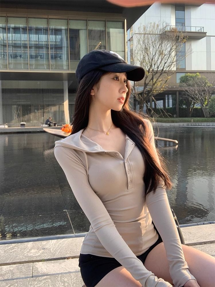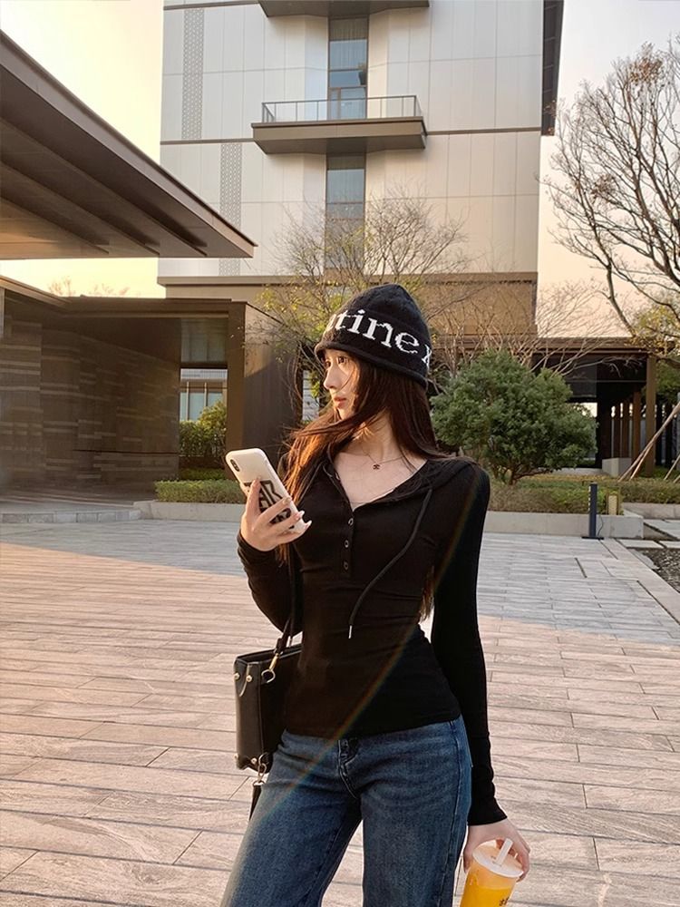 简约美式辣妹修身显瘦半开扣连帽卫衣收腰早秋内搭长袖学生上衣女