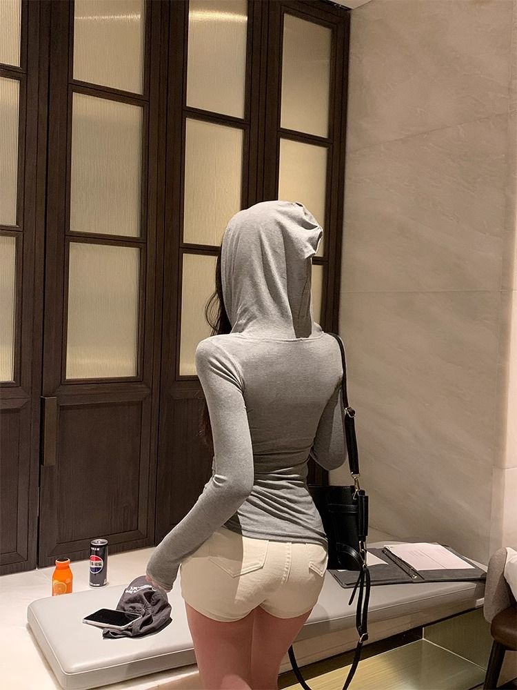 2025年春秋新作 長袖フード付きTシャツ レディース スリムフィット 韓国風 無地 上品 ニッチ プルオーバー