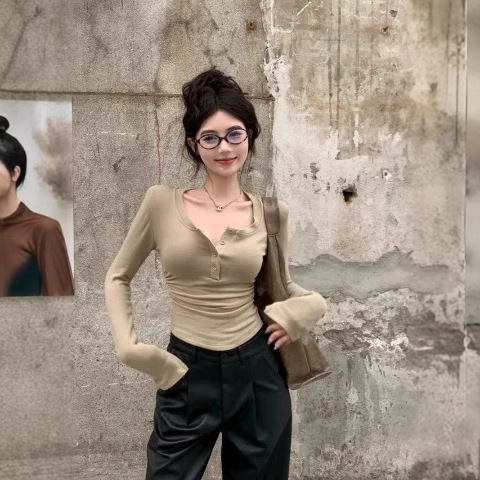 AA*AD同款纯欲复古亨利领长袖t恤女春秋新款收腰显瘦打底衫上衣