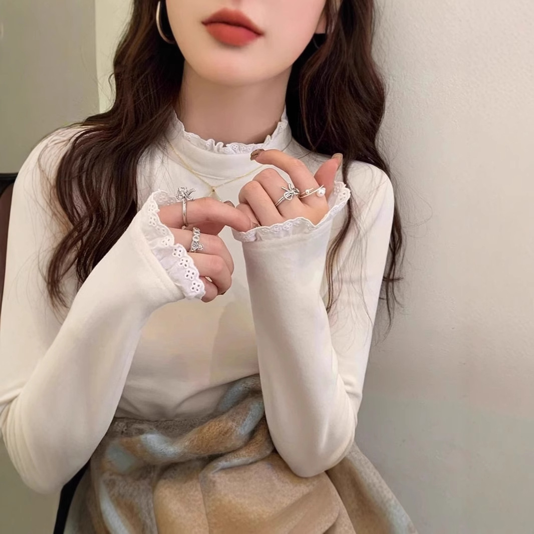 【工場現物】甘妹純欲風長袖tシャツ女性レースエッジデザイン感半高襟シャツ