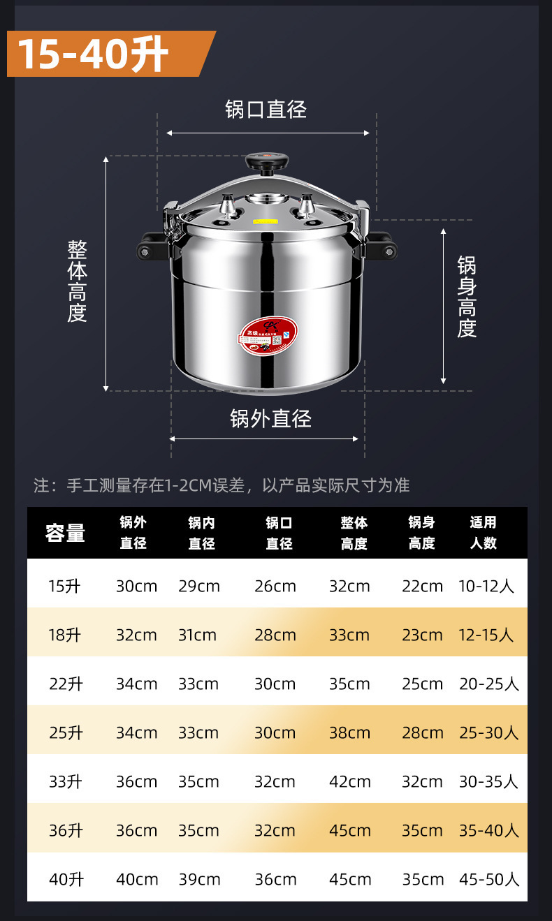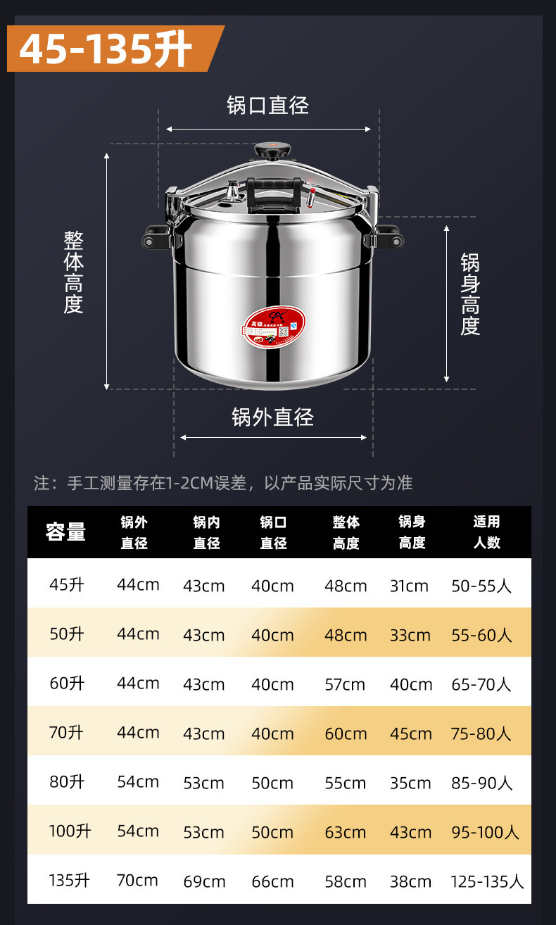 ガス専用9リットル(約8人分) 直径26cm,11リットル(約12人分)ガス専用 直径28cm,15リットル(約15人分)ガス専用 直径30cm,15リットル(15人分)電磁調理器・ガス両用 直径30cm,18リットル(約18人分)ガス専用 直径32cm,18リットル(18人分)電磁調理器・ガス両用 直径32cm,22リットル(約25人分)ガス専用 直径34cm,22リットル(25人分)電磁調理器・ガス両用 直径34cm,ガス専用 25リットル(約30人分) 直径34cm,25リットル(30人分)電磁調理器・ガス両用 直径34cm,33リットル(約35人分)ガス専用 直径36cm,33リットル(35人分)電磁調理器・ガス両用 直径36cm,36リットル(約40人分)ガス専用 直径36cm,36リットル(40人分)電磁調理器・ガス両用 直径36cm,40リットル(約45人分)ガス専用 直径40cm,40リットル(45人分)電磁調理器・ガス両用 直径40cm,45リットル(約51人分)ガス専用 直径44cm,45リットル(50人分)電磁調理器・ガス両用 直径44cm,50リットル(約60人分)ガス専用 直径44cm,50リットル(65人分)電磁調理器・ガス両用 直径44cm,ガス専用60リットル(約70人分) 直径44cm,70リットル(80人分)電磁調理器・ガス両用 直径44cm,ガス専用80リットル(約100人分) 直径54cm,100リットル(約150人分)ガス専用 直径54cm,135リットル(約180人分)ガス専用 直径70cm