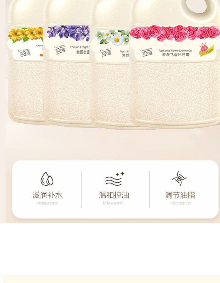 香り ローズの香りのシャワージェル、カモミールの香りのシャワージェル、フレッシュフローラルの香りのシャワージェル、ラベンダーの香りのシャワージェル