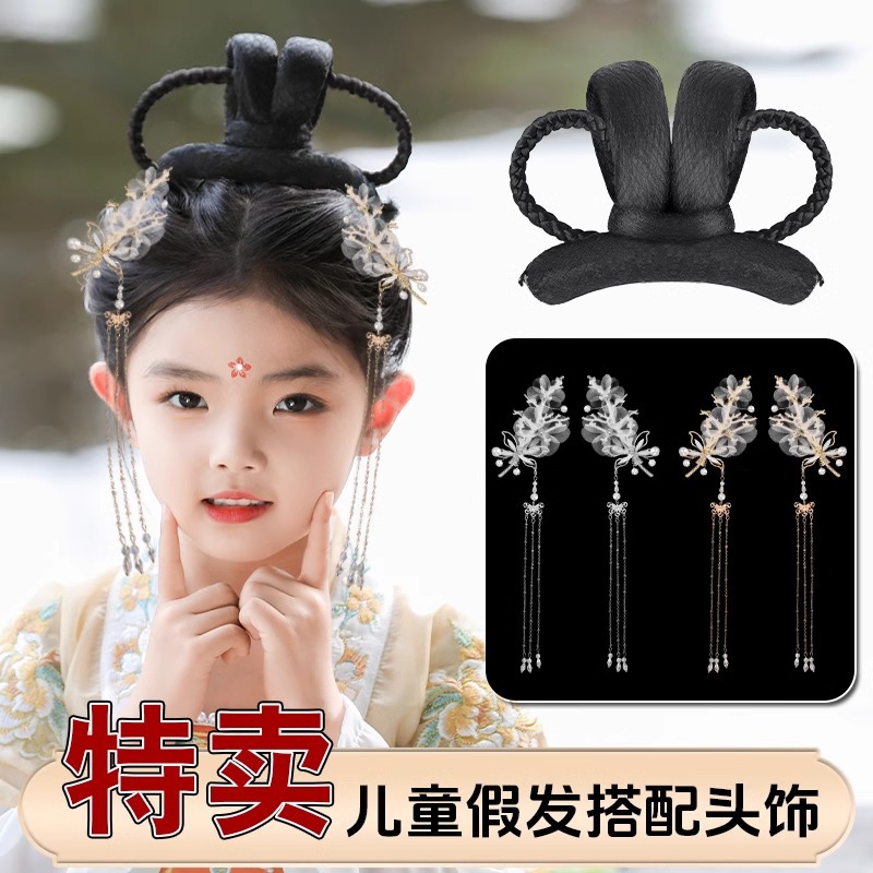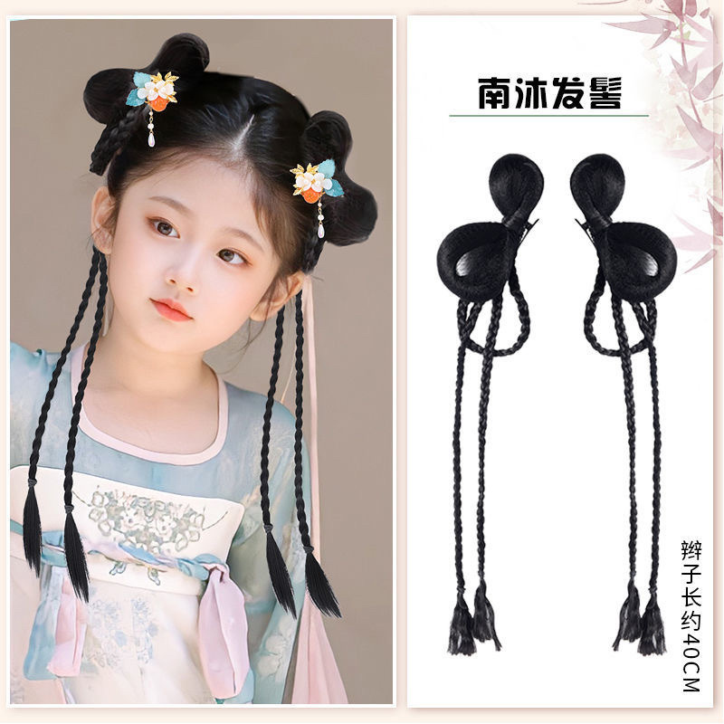 子供用漢服ウィッグとヘッドギア、女性用の古代中国風の三つ編みヘアピン、パフォーマンススタイル