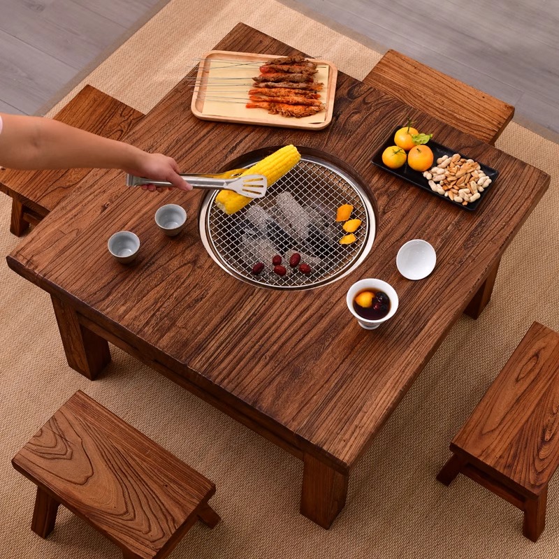老榆木围炉煮茶桌子烤火炉套装阳台室内实木火锅烧烤一体桌庭院