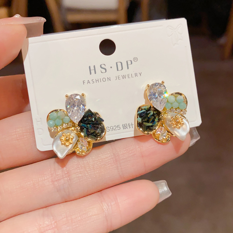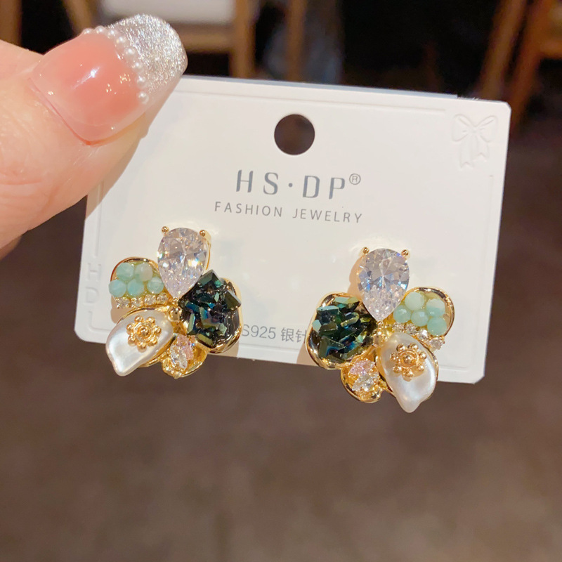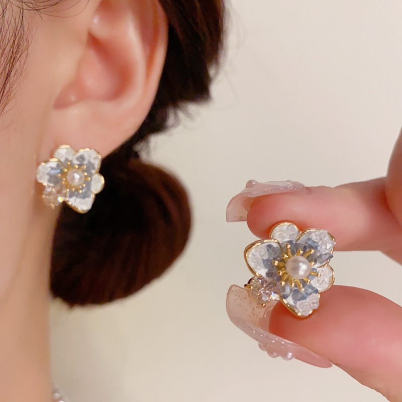 小清新ファッション甘美百合水晶真珠花ピアスs925銀針気質シンプルで洗練されたイヤリング女