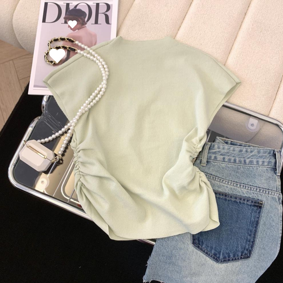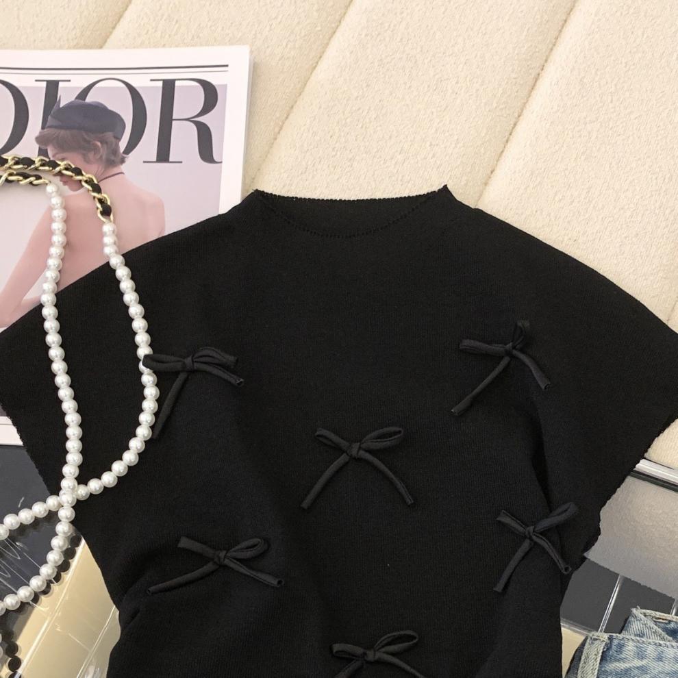 2025年ホットスタイル韓国風遊び心のあるリボンスタンドカラースリムセーターイン通勤半袖トップス