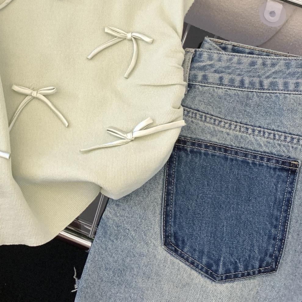 2025年初春の新作韓国風遊び心のある女の子のリボンスタンドカラースリム半袖セーター