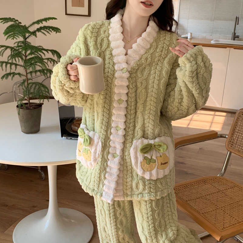 2025年秋冬用コーラルベルベットパジャマ 厚手で暖かいフランネル素材、外出着としても使えるルームウェアセット、フェアリースタイル