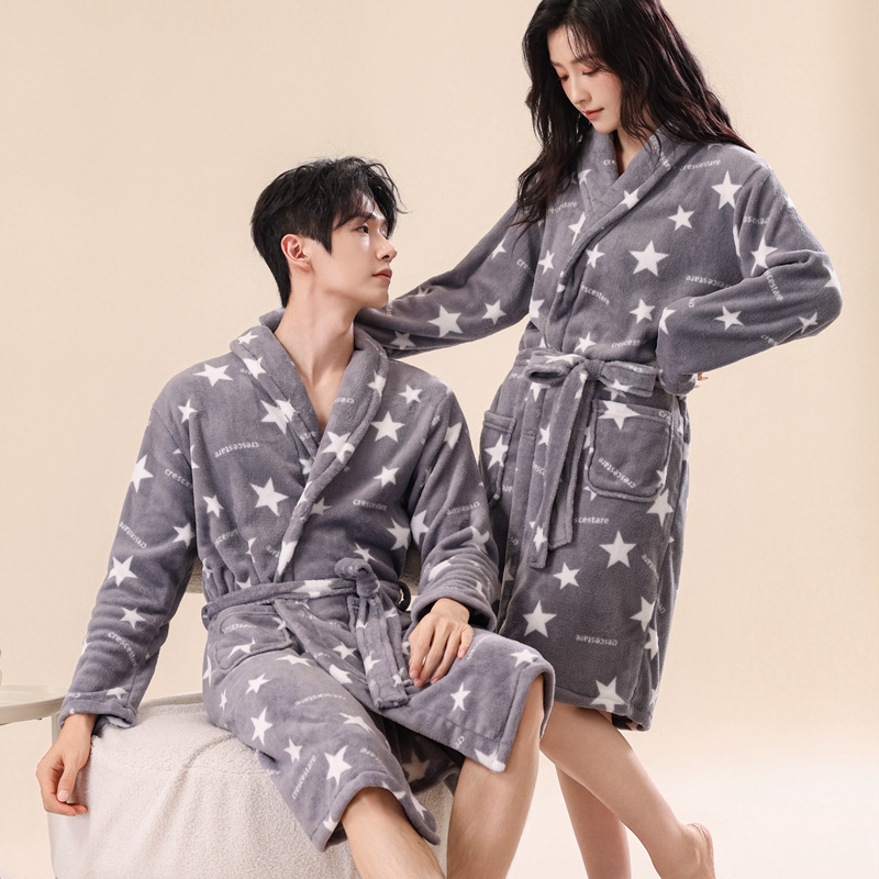 女士睡袍秋冬款男士浴袍情侣法兰绒星星睡衣秋冬保暖家居服中长款