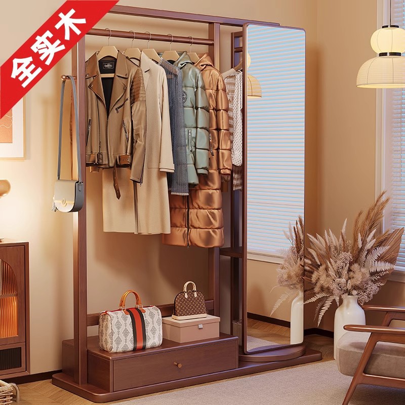 無垢材のコートラック、床置き洋服ラック、ドレッシングミラー、一体型全身鏡、寝室収納ラック、ホームリビングルーム洋服ラック