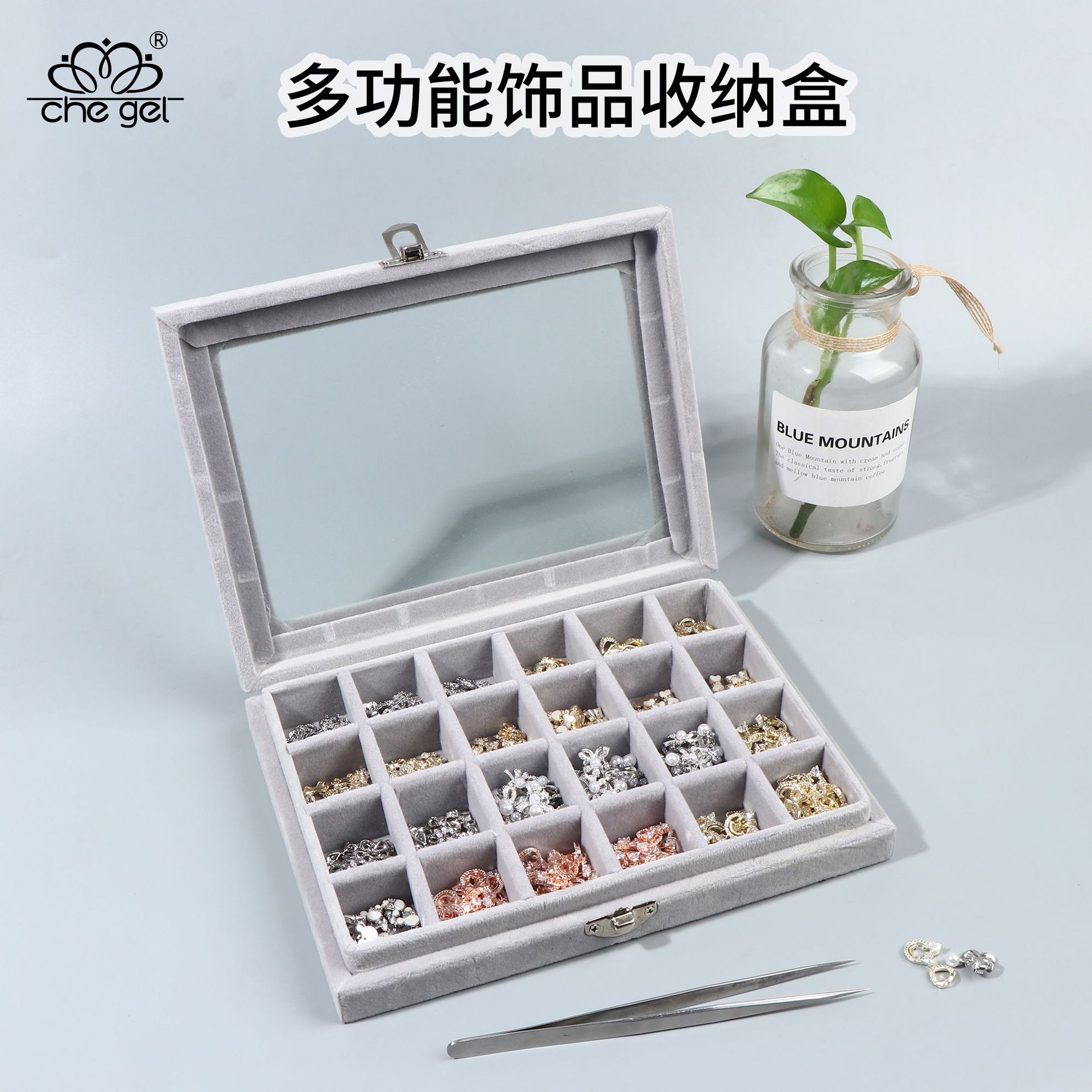现货透明翻盖防尘绒布饰品收纳盒耳钉戒指分格珠宝美甲收纳盒