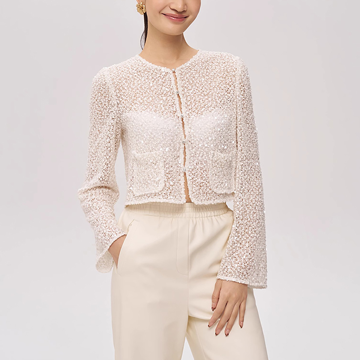 CHICYOU 白色透明亮片小香上衣气质闪闪轻薄透气百搭显瘦短款开衫