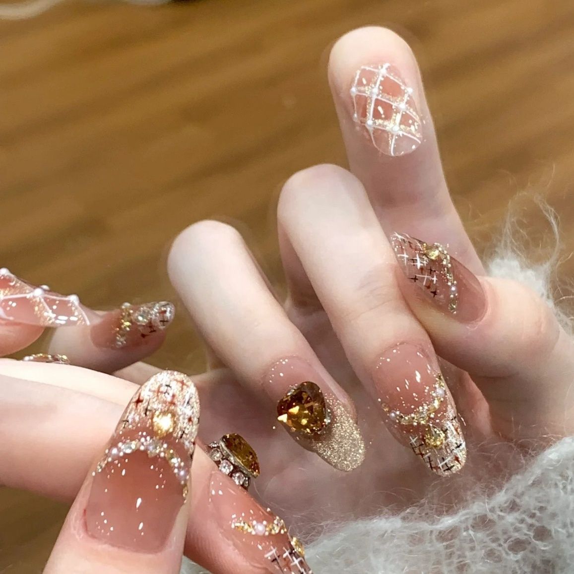 纯手工纯欲风千金香风芭蕾珍珠格纹珍珠气质氛围感显白美甲穿戴甲