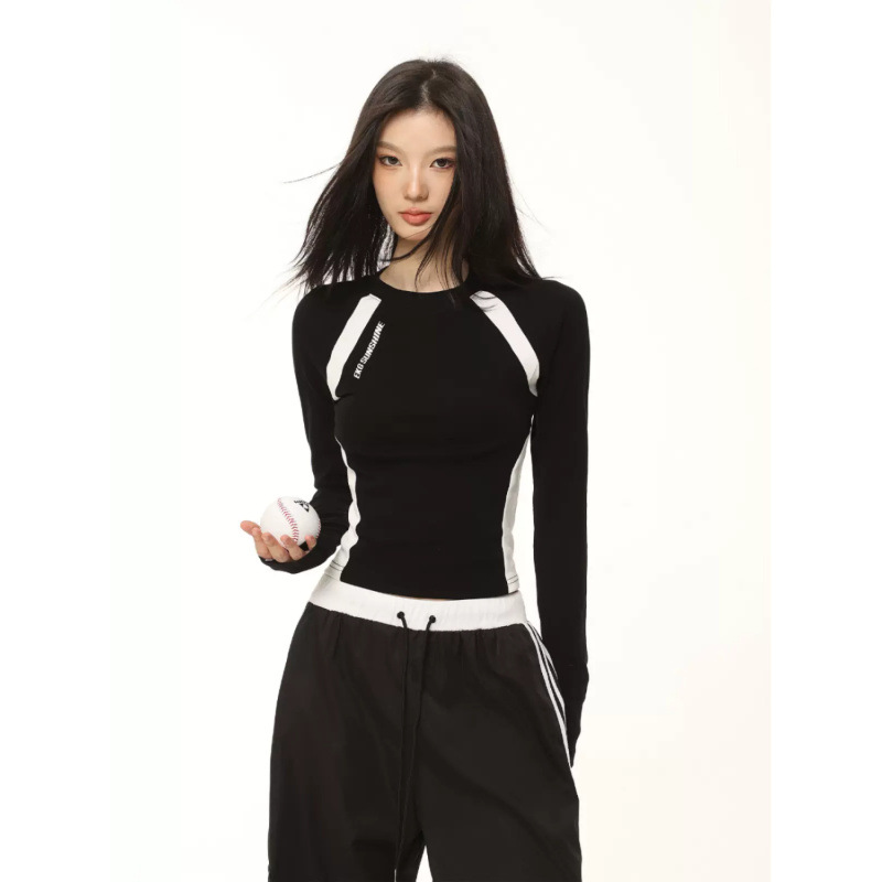 アメリカのレトロな衝突色の正肩長袖ランニングスポーツtシャツ女性の春の甘いクールな修身はやせています。