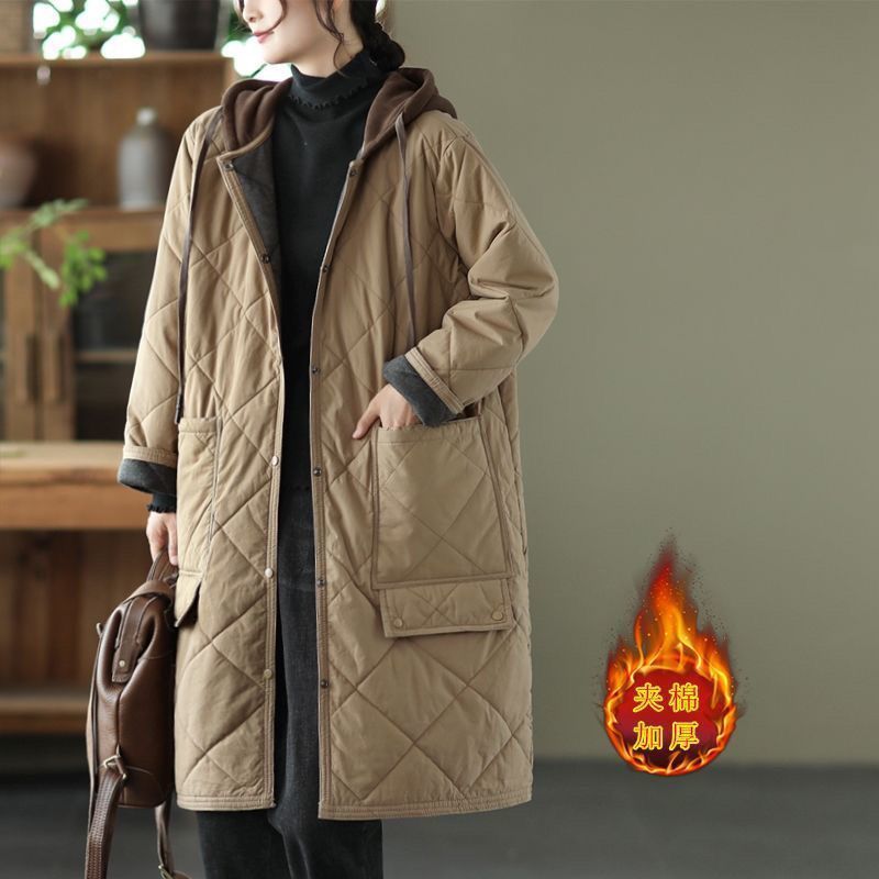 文芸の大きいサイズの菱格の帽子の冬の新型の綿服のコートの女性のゆったりしているカジュアルな中の長いタイプは綿を挟んで厚手の綿服を厚くします。
