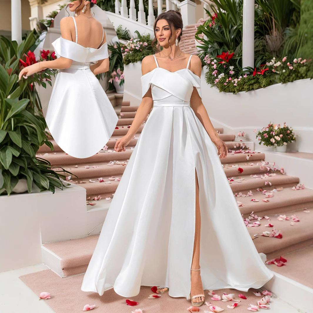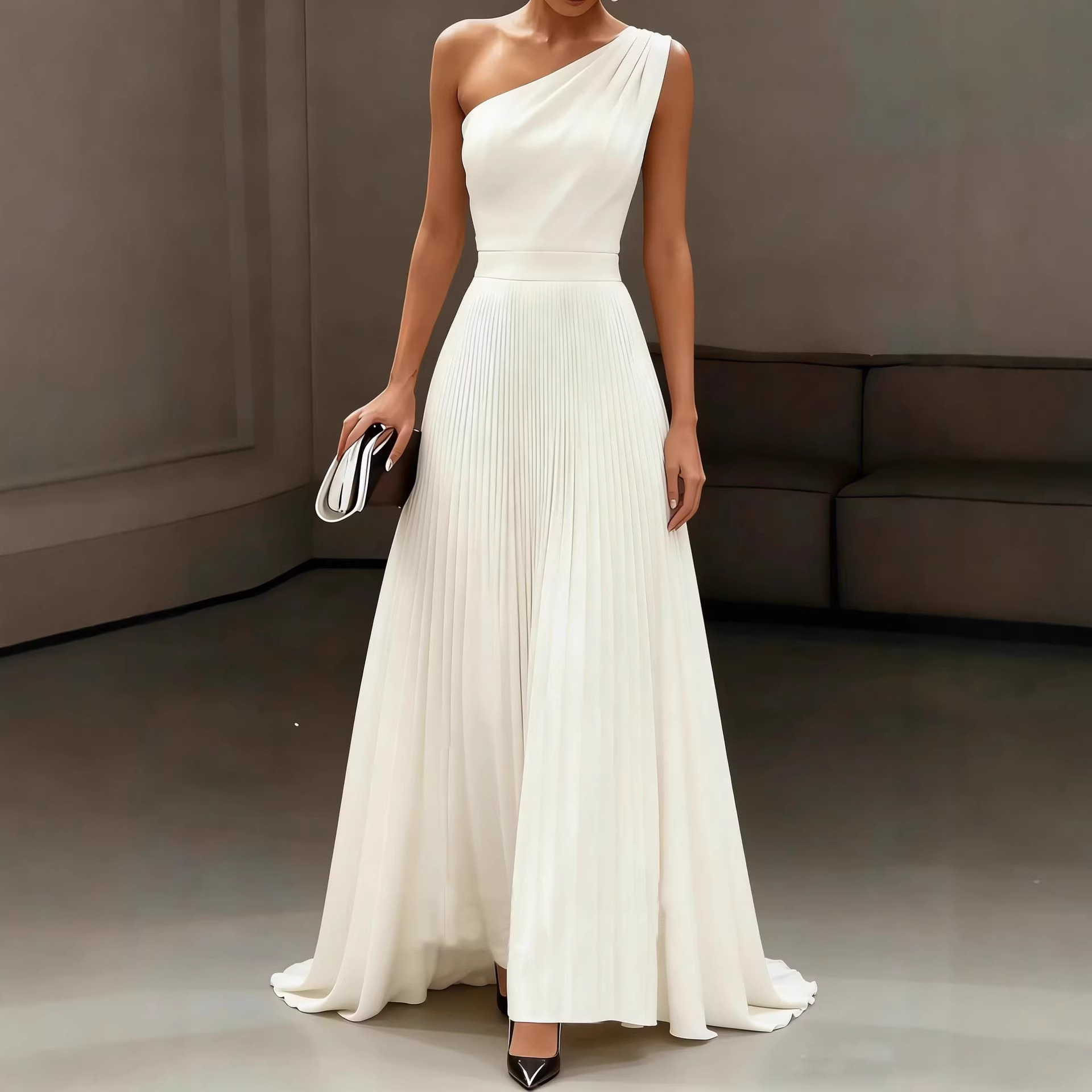 2026新款欧美风单肩白色长裙优雅百褶礼服夏季气质婚礼礼服中东