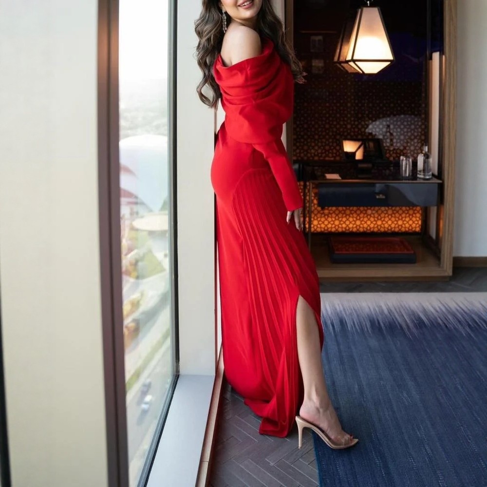2026红色一字肩褶皱长袖晚礼服连衣裙修身显瘦宴会派对礼服裙中东