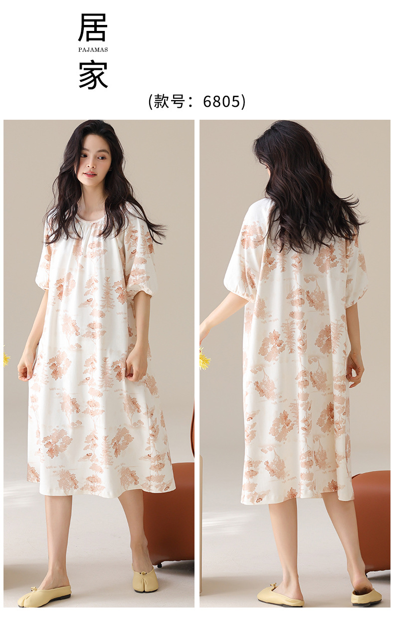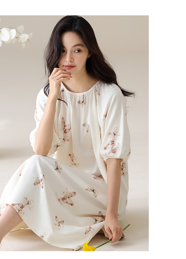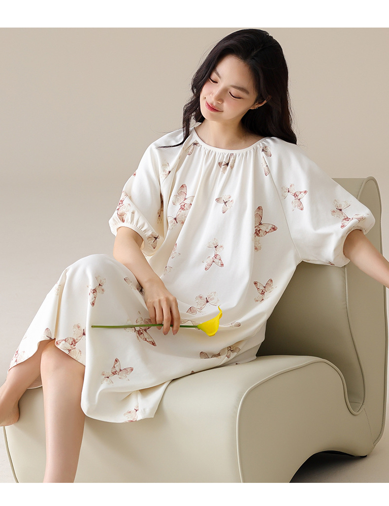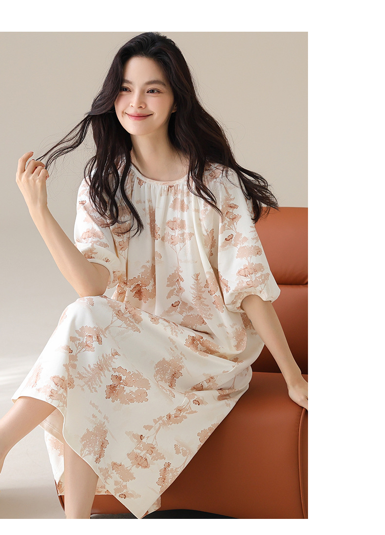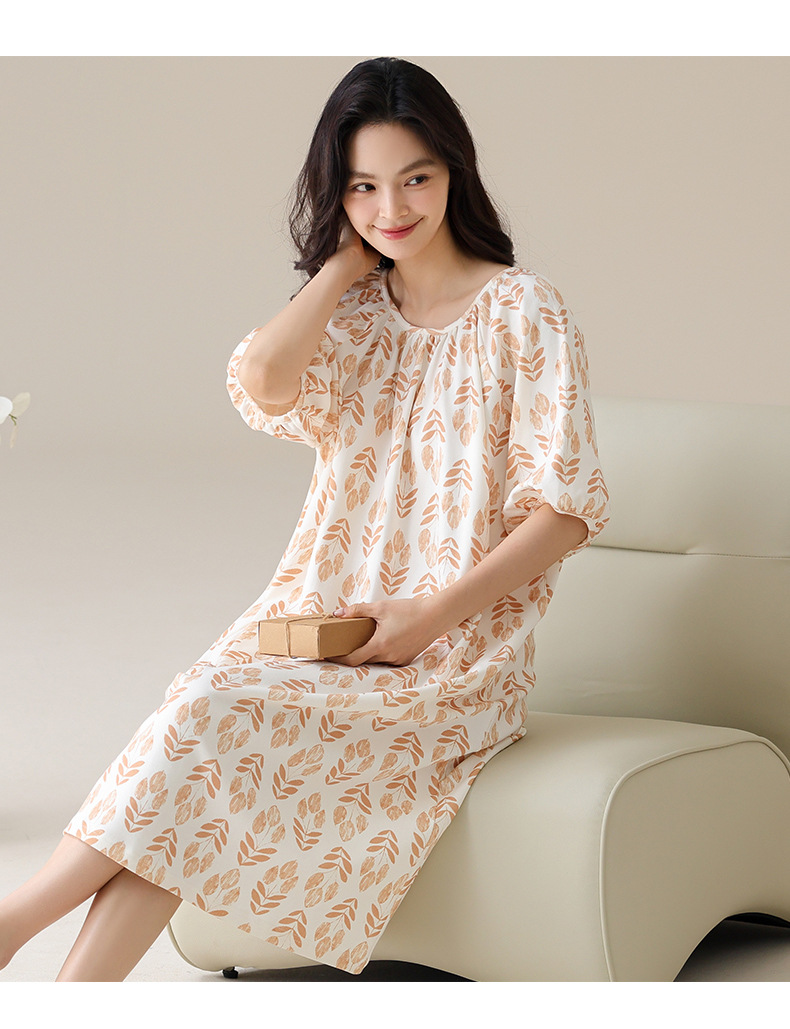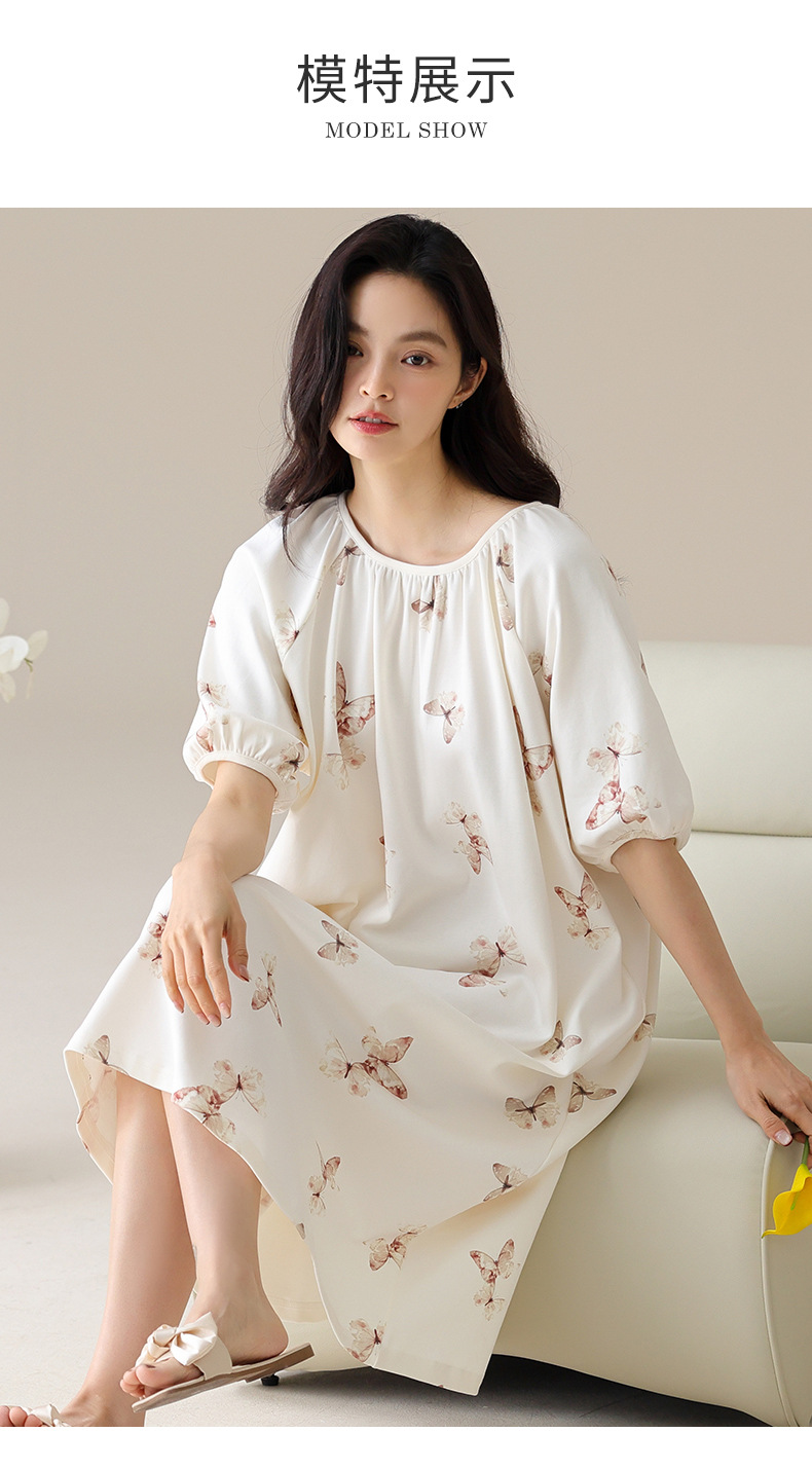 モーダルパジャマ女性の夏の新しい睡眠スカートの中で、長い丸首の提灯の袖の大きいサイズは女性の家の服を着ることができます。
