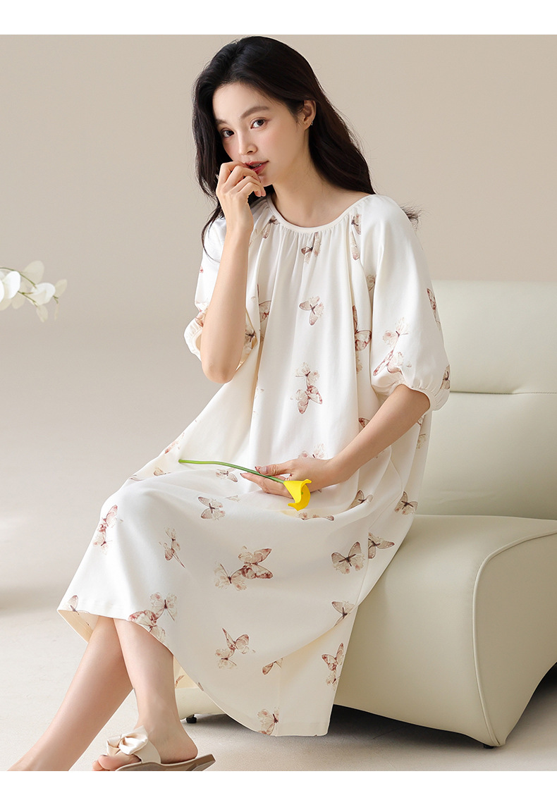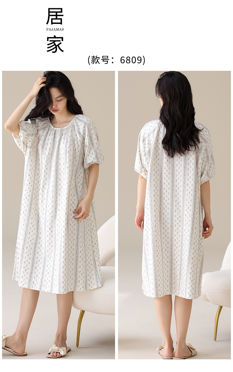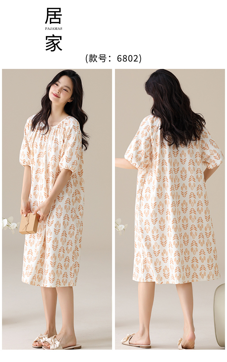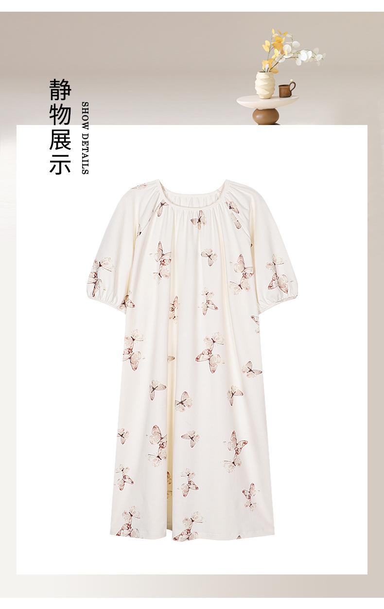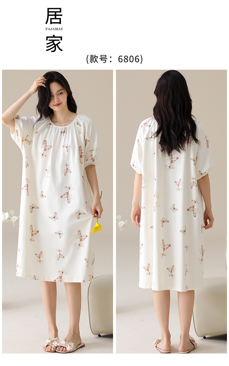 モーダルパジャマ女性の夏の新しい睡眠スカートの中で、長い丸首の提灯の袖の大きいサイズは女性の家の服を着ることができます。