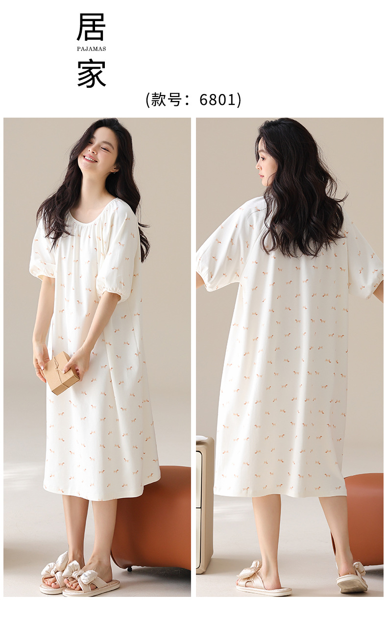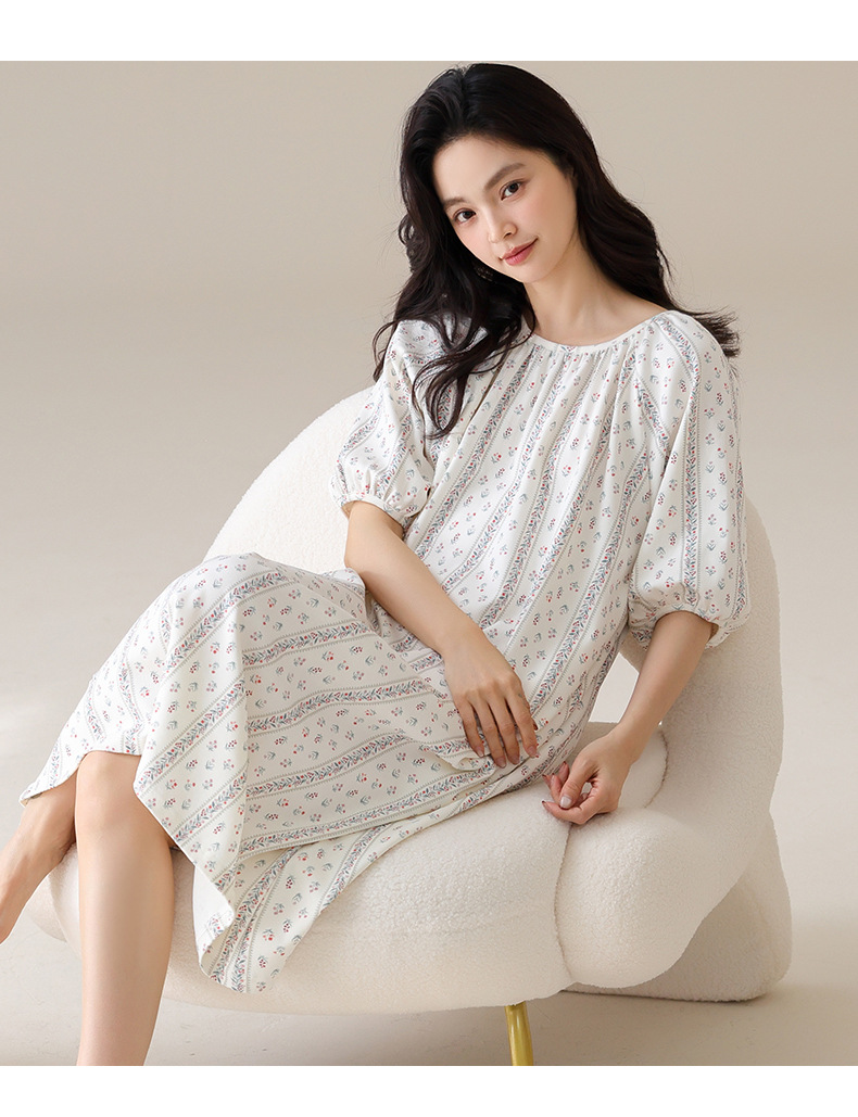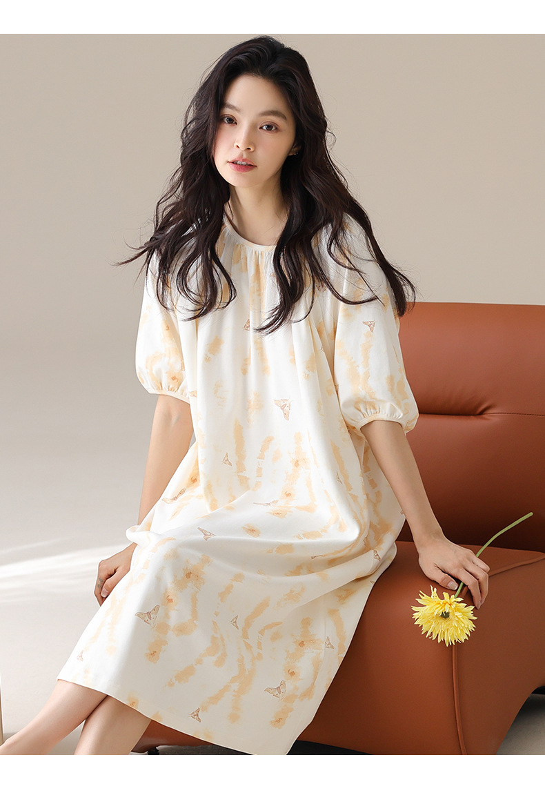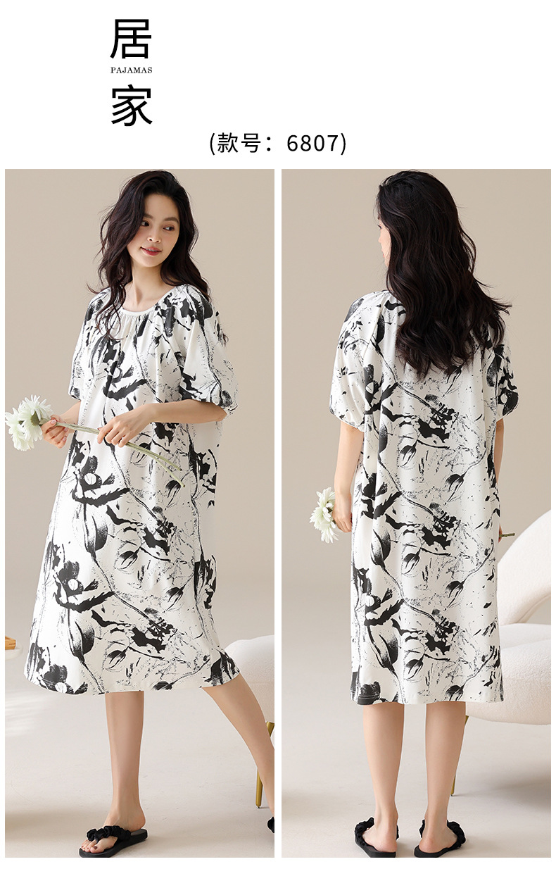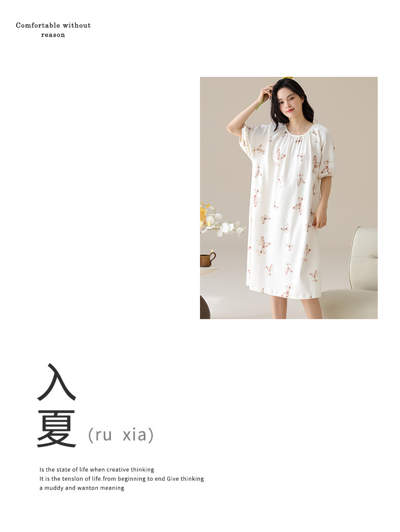 モーダルパジャマ女性の夏の新しい睡眠スカートの中で、長い丸首の提灯の袖の大きいサイズは女性の家の服を着ることができます。