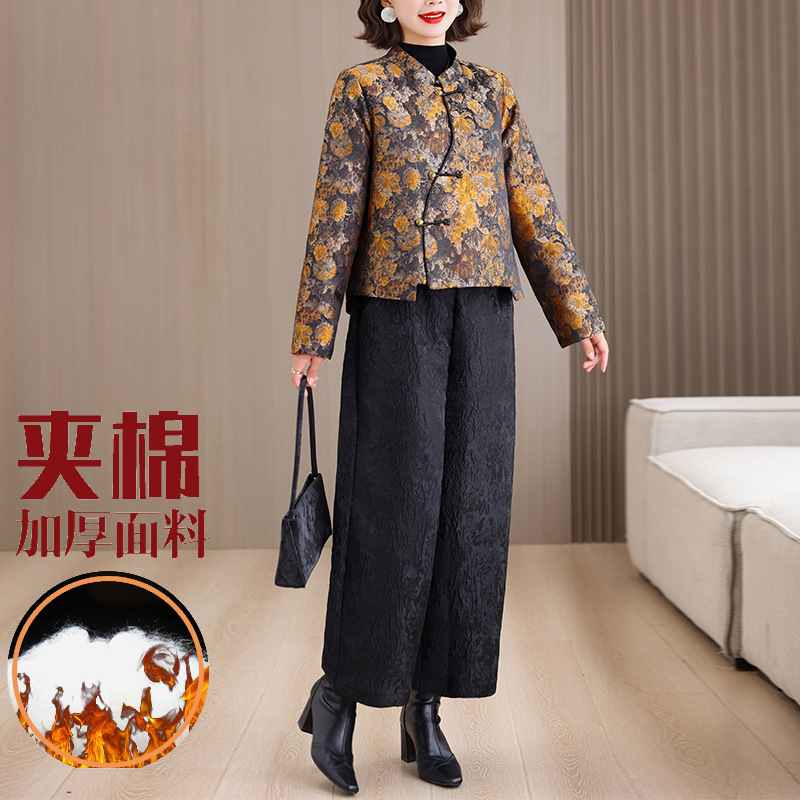 2025新款新中年妈妈中式外套女提花高端洋气百搭棉服阔腿裤套装