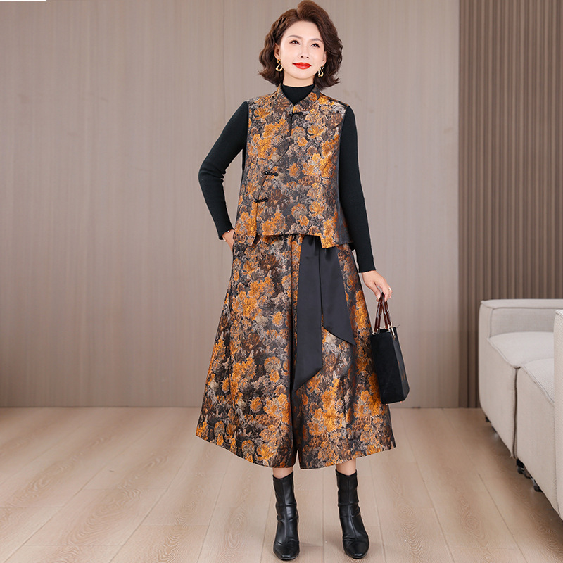 2025秋季新款中年妈妈休闲百搭花苞阔腿裤女时尚洋气马甲两件套