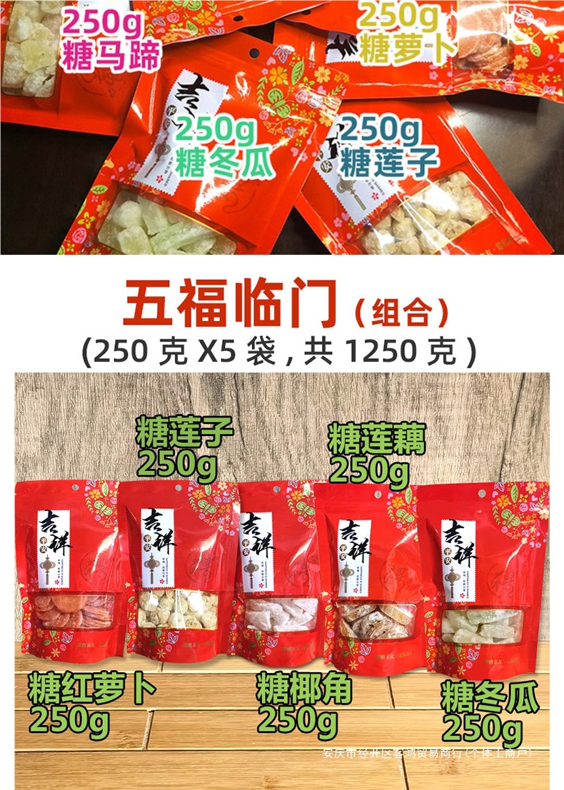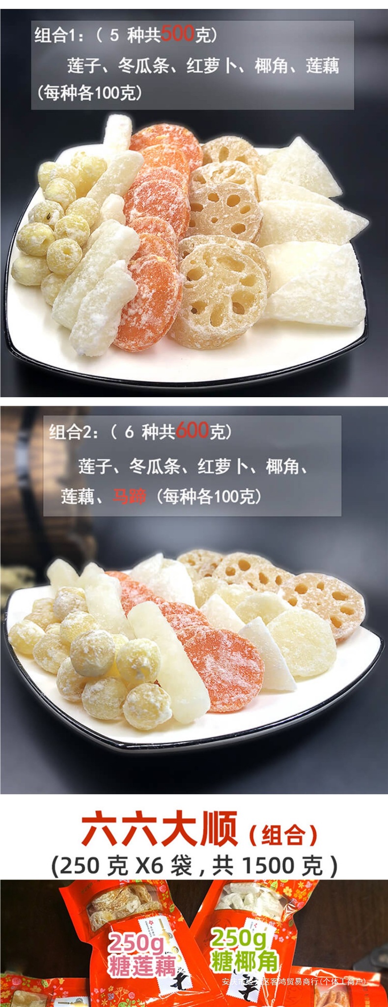 梱包仕様 組み合わせ2(6種類、各100g、合計600g),組み合わせ1(5種類、各100g、合計500g),砂糖蓮の実 500g(250g×2袋),砂糖冬瓜 500g(250g×2袋),糖漬けれんこん 500g(250g×2袋),シュガーココナッツ角 500g(250g×2袋),砂糖漬け大根 500g(250g×2袋),シュガーホースシュー 500g(250g×2袋),生姜砂糖漬け 500g(250g×2袋),柳柳大順(250g×6袋、合計1500g),五つの祝福(250g×5袋、合計1250g),その他の組み合わせ(オンラインカスタマーサービスにお問い合わせください)