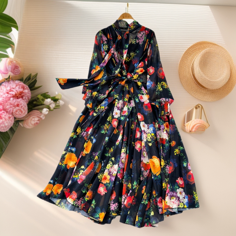 外贸法式优雅气质连衣裙春装女系带蝴蝶结领修身长款大摆雪纺度假