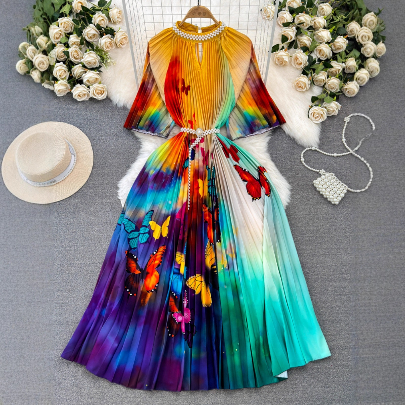 外贸时尚轻奢褶皱短袖钉珠立领收腰显瘦a字渐变色印花大摆连衣裙