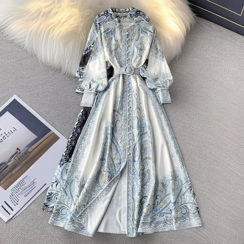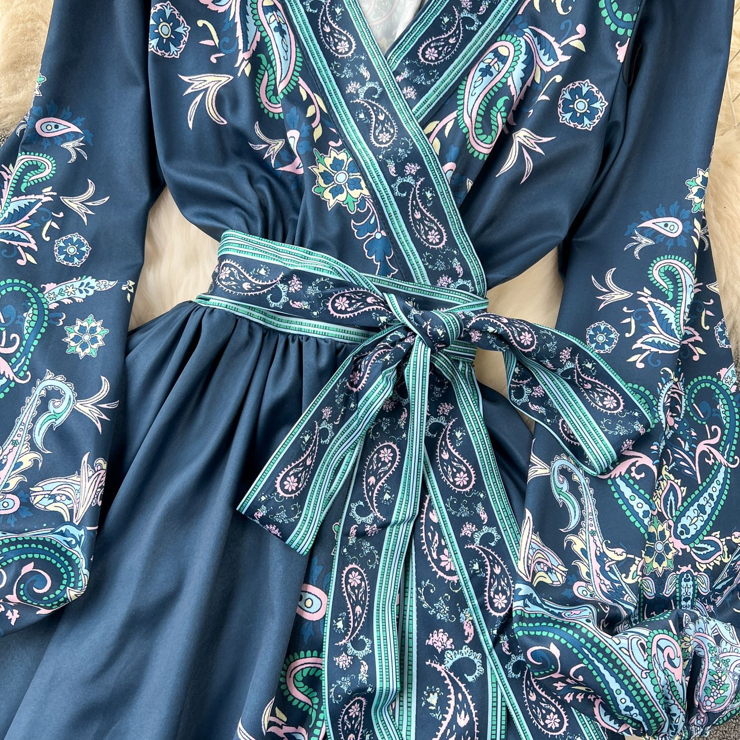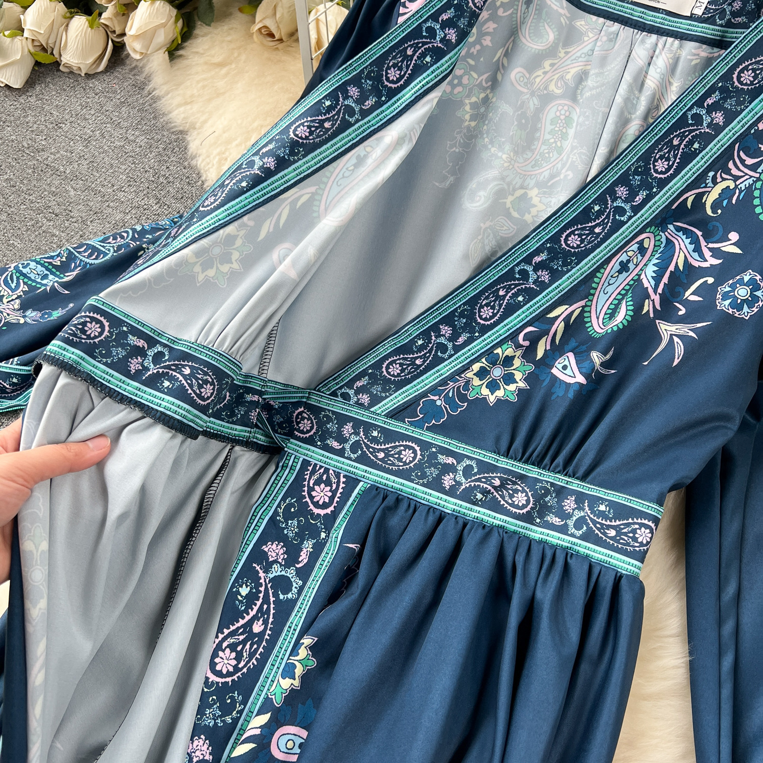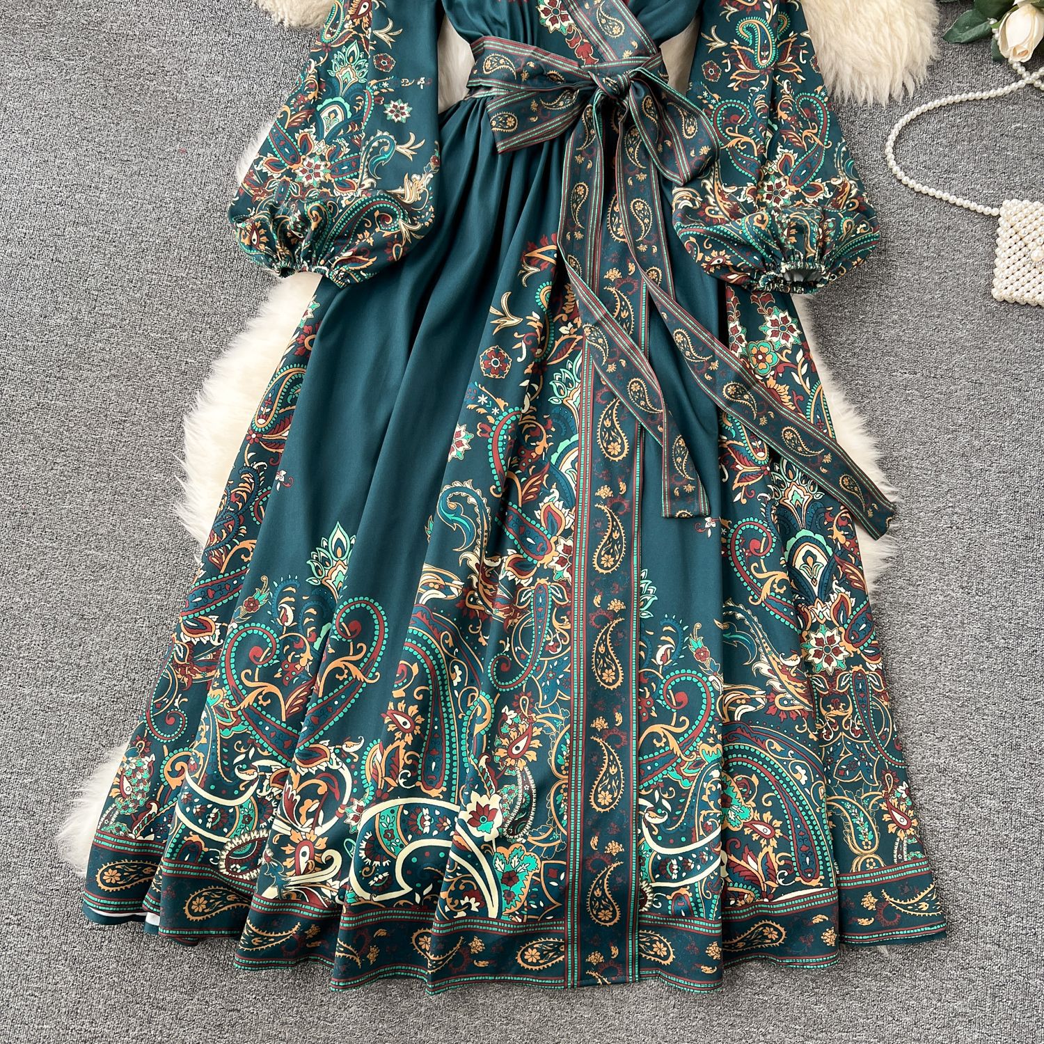 外贸复古宫廷风灯笼长袖V领收腰系带a字印花连衣裙优雅大摆礼服长