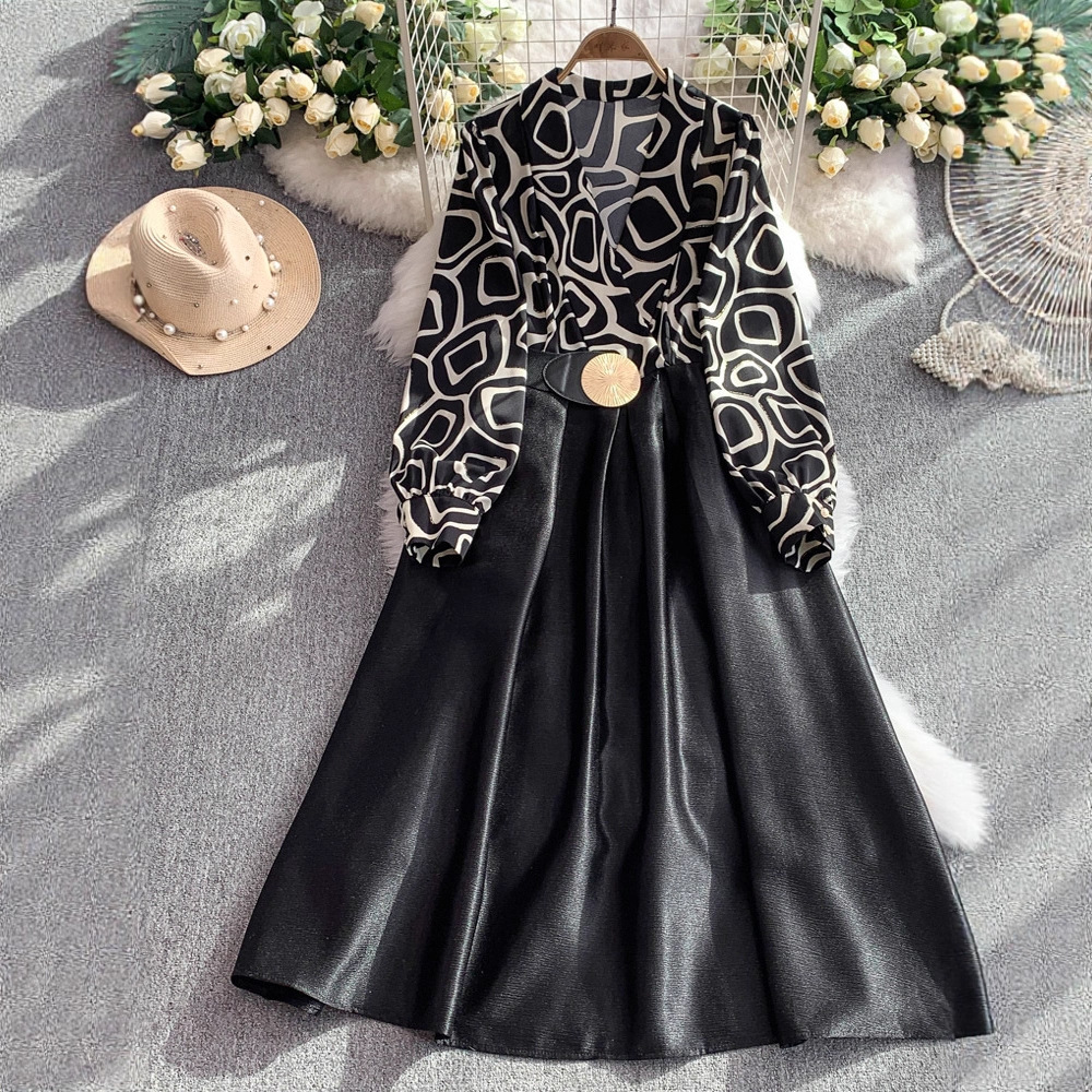 外贸高级感轻熟风气质V领印花长袖连衣裙女收腰显瘦拼接蓬蓬礼服