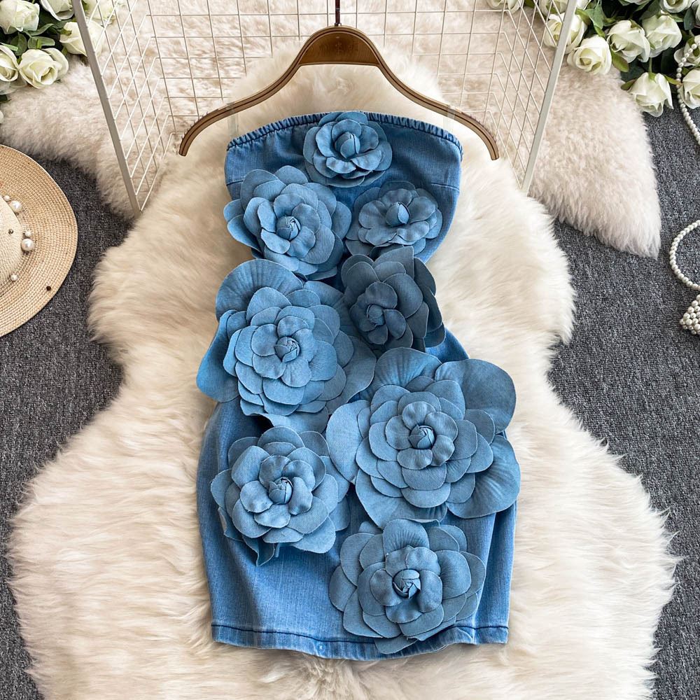 外贸高级感气质晚会手工立体大花朵抹胸连衣裙收腰显瘦别致牛仔礼