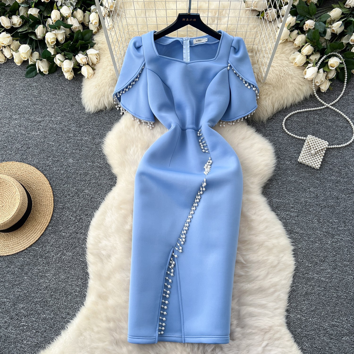 外贸欧美礼服女2025春装高级感钉珠流苏方领短袖收腰修身开 叉洋