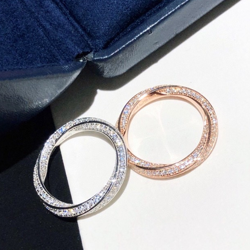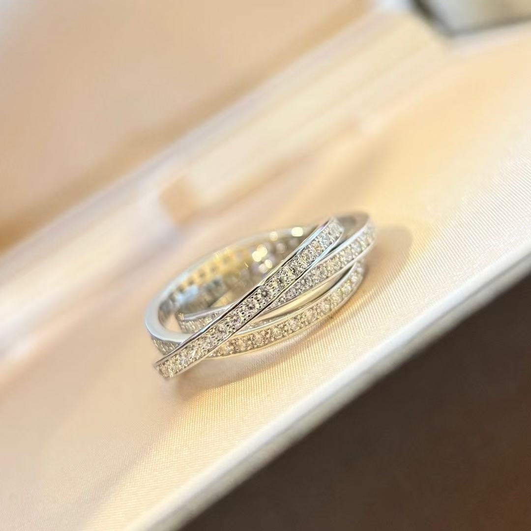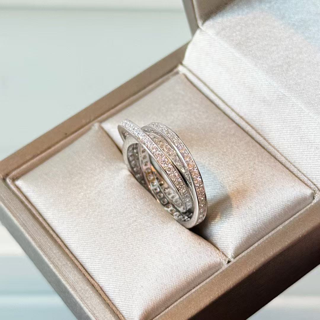 S925银精工带钻三色三圈戒指轻奢三金简约排钻单圈钻高级经典指环