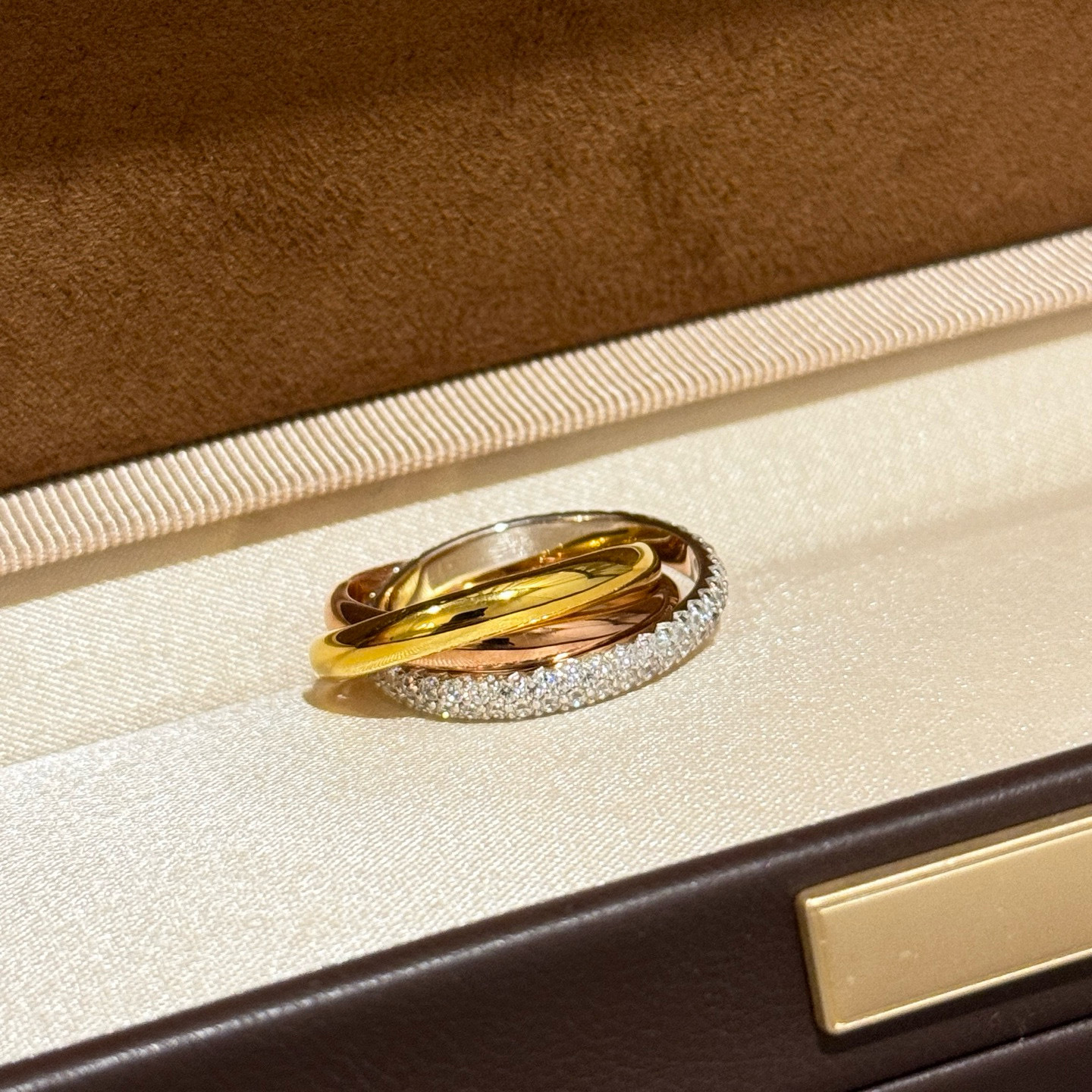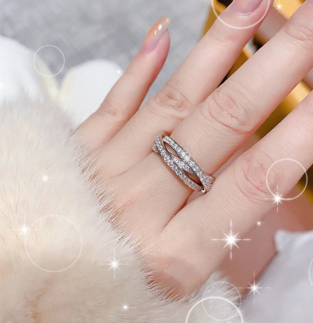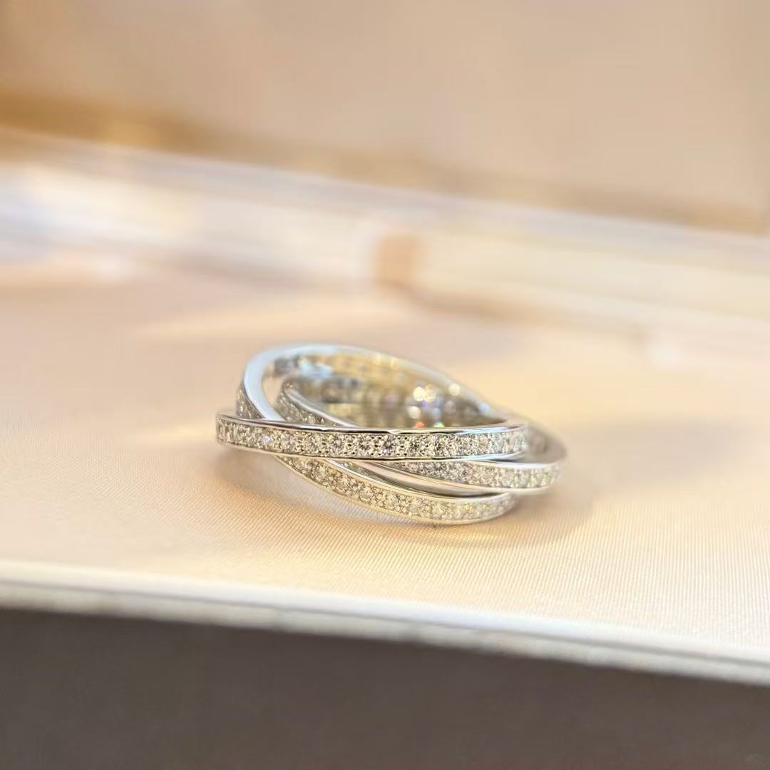 S925银精工带钻三色三圈戒指轻奢三金简约排钻单圈钻高级经典指环