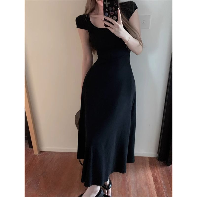 フランス風の雰囲気のヘボン風の方襟の半袖のワンピースの女性の夏の修身はやせて腰のa字を収めて膝の長いスカートを過ぎます。