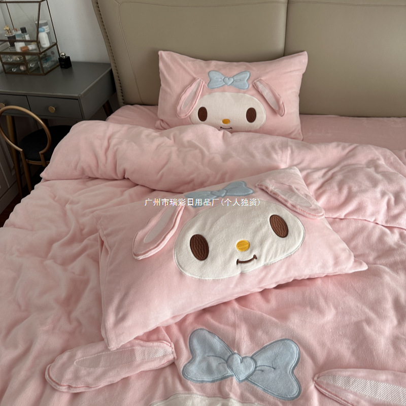 かわいい秋冬ティ寝具牛乳刺繍柔らかい4点セット少女心ピンク厚パイル保温美楽