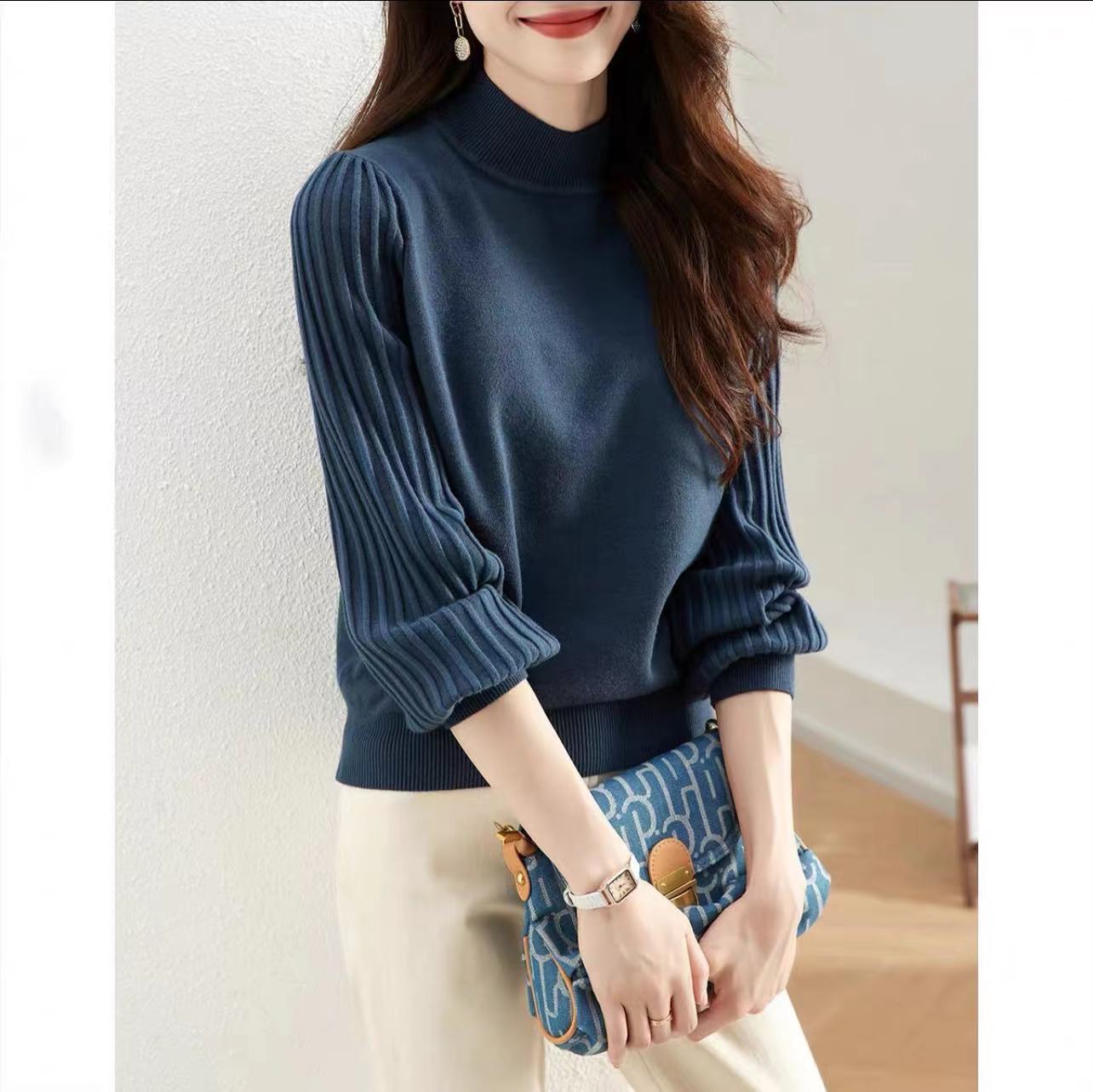 シンプルなレディースニットセーター 2024年秋新作 上品なインナーウェア ニットセーター ハーフタートルネック パッチワーク袖 トレンド