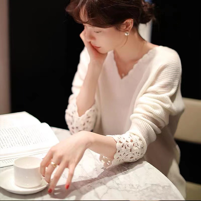 透かし彫りの長袖のニットはだらだらしています。
