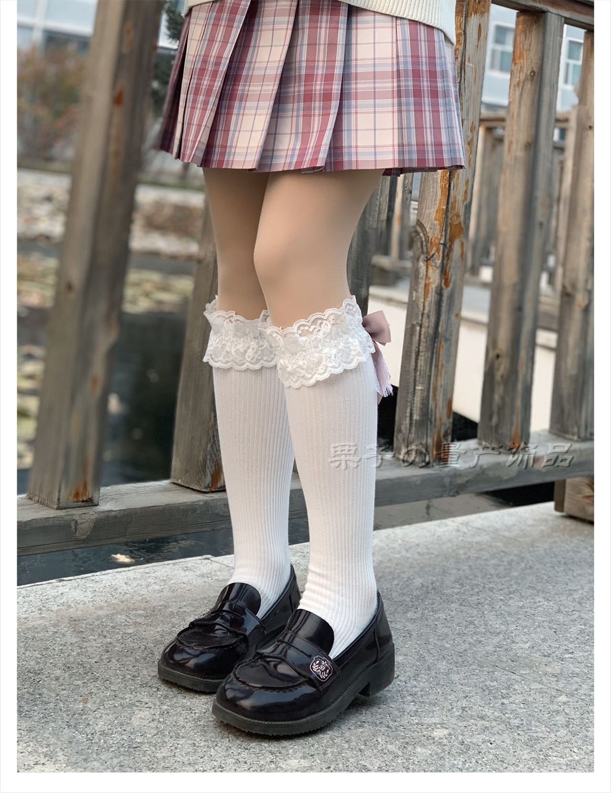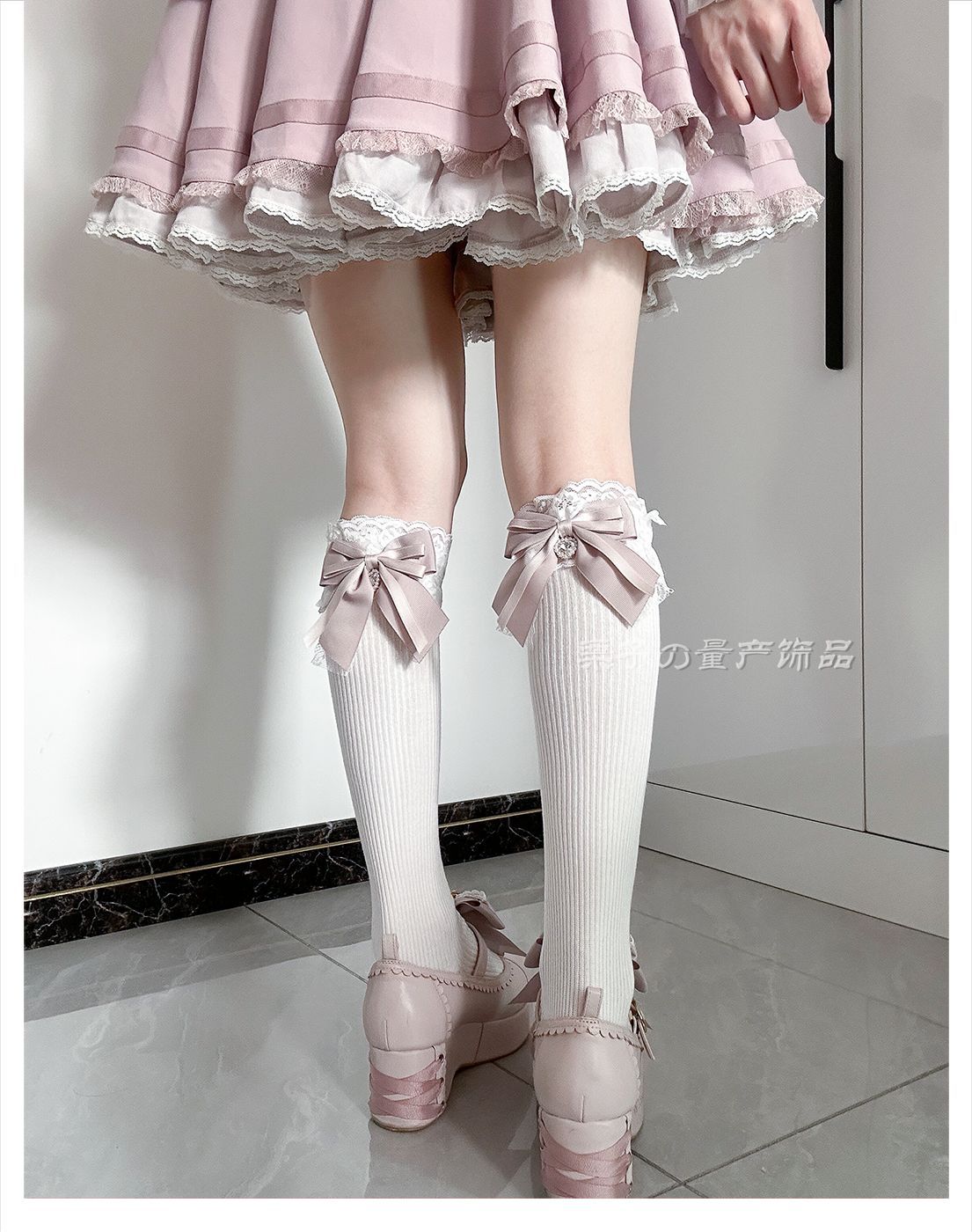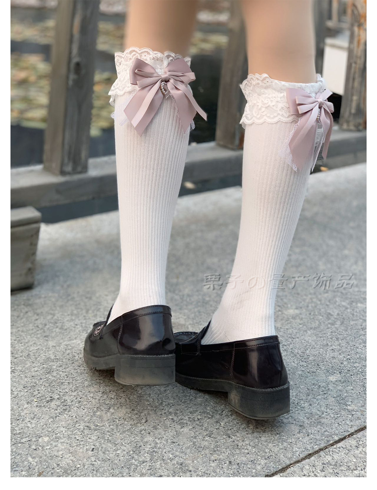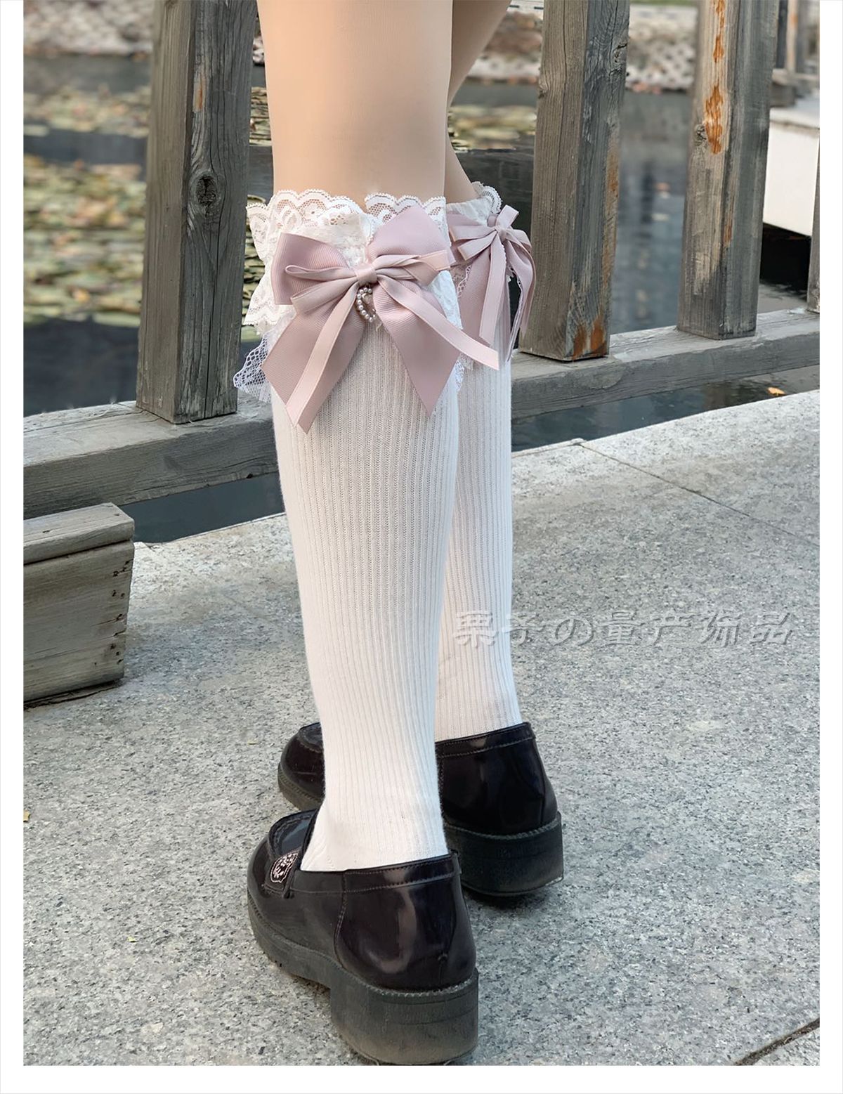 量産白リボンレースミッドカーフソックス、膝上ソックス、和風美脚痩身カレッジスタイル