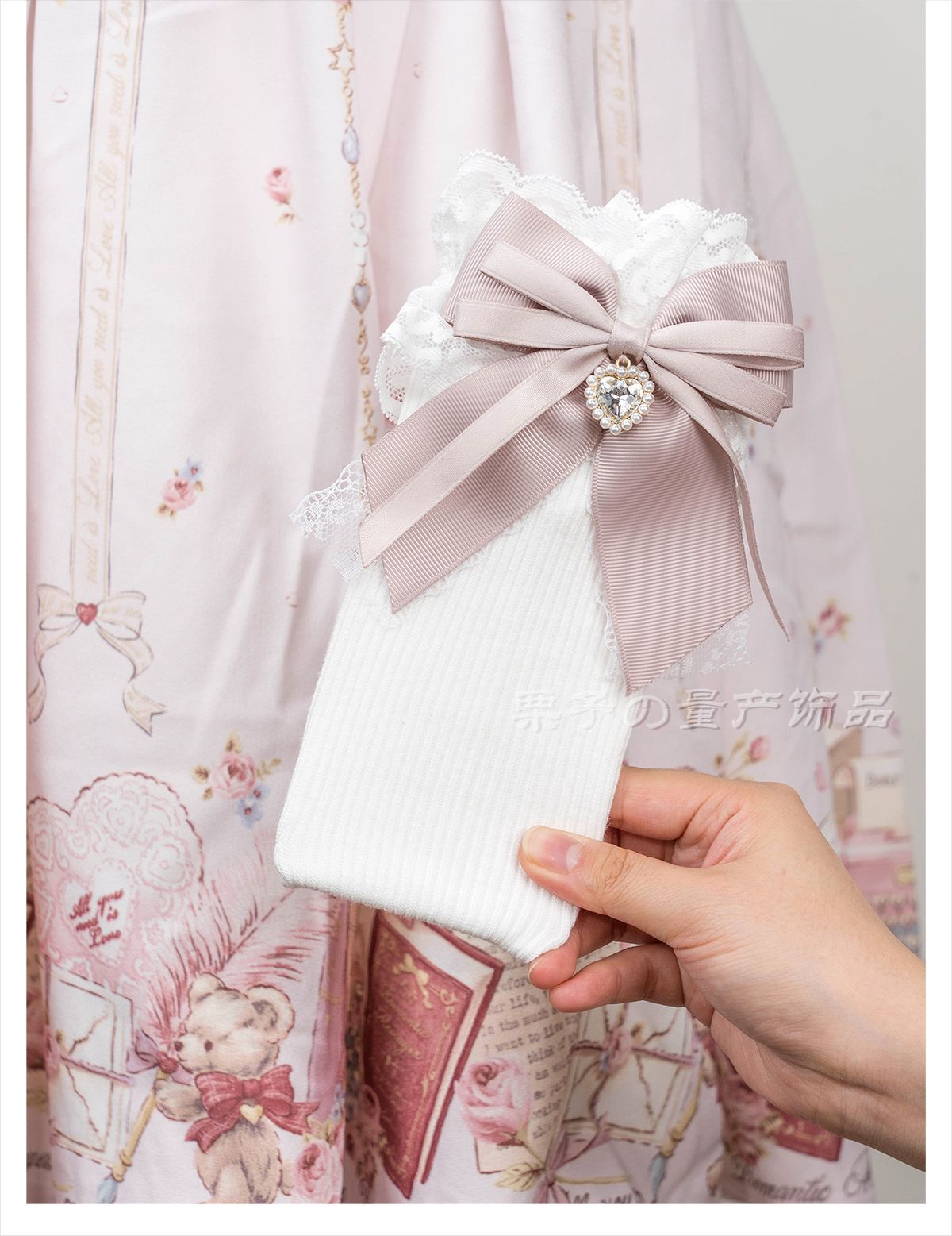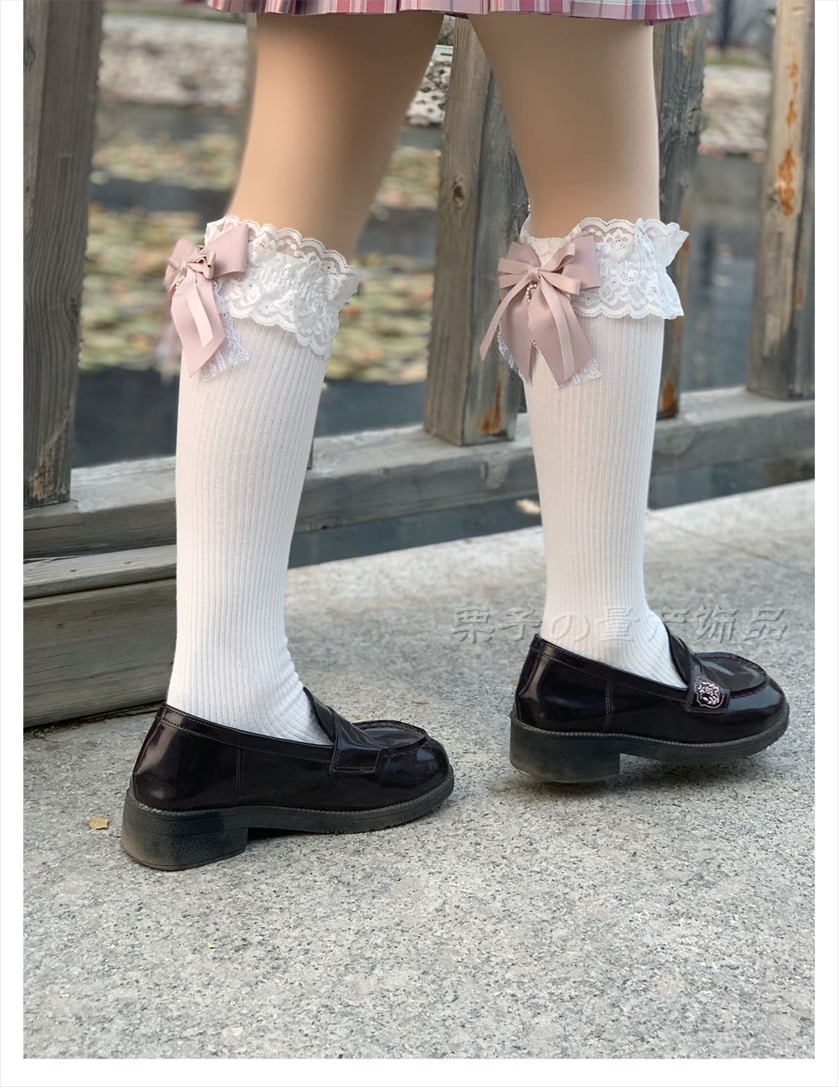 ロリータソックス レース飾り付きニーハイソックス 甘いリボン付きロングソックス 綿ソックス JK ミルクホワイト カーフソックス ロリータソックス