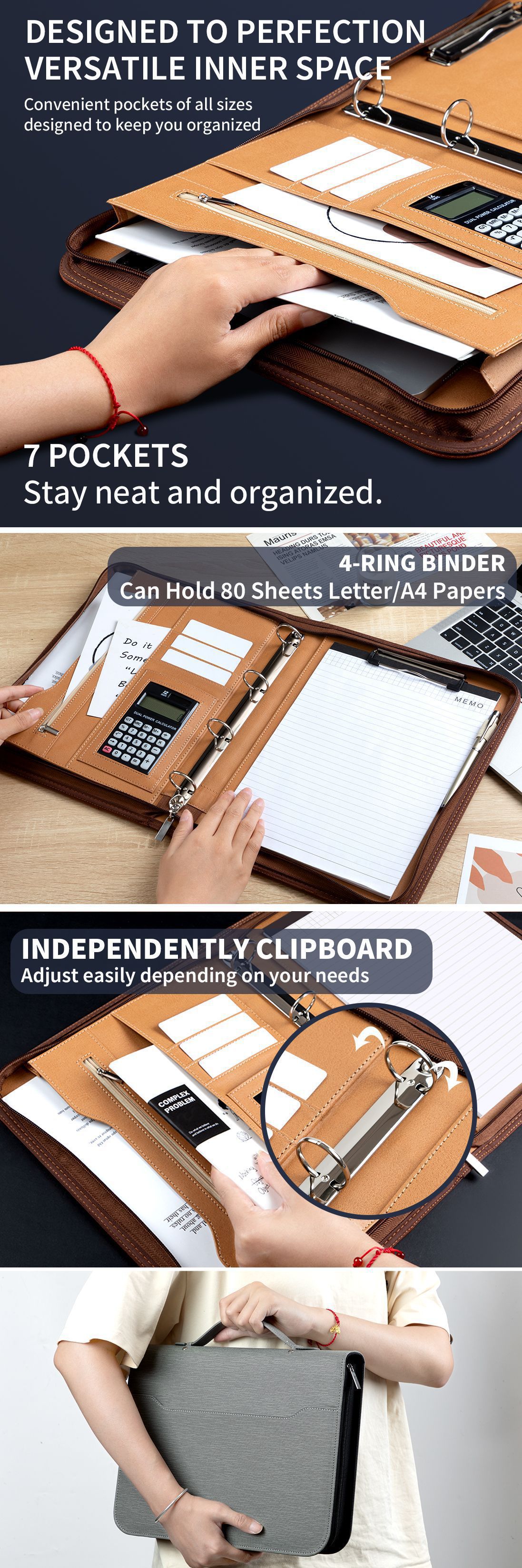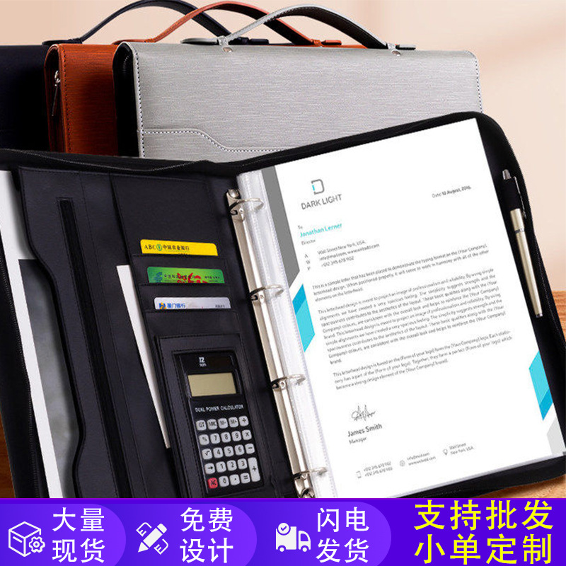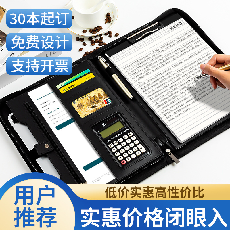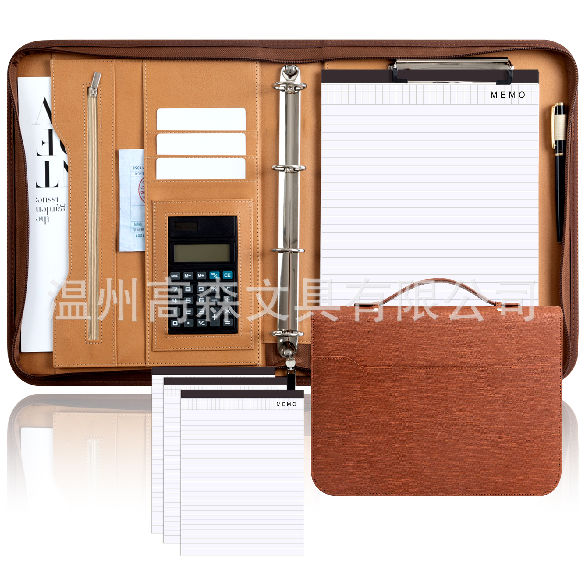 A4皮质多功能活页文件夹定制logo商务手提拉链包经理夹带计算器