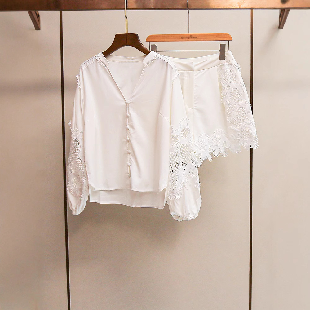 法式小众2025早春新款时尚镂空花纹拼接衬衫+刺绣蕾丝边短裤套装