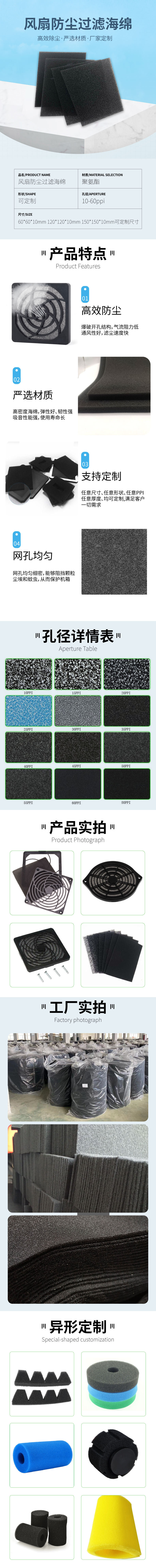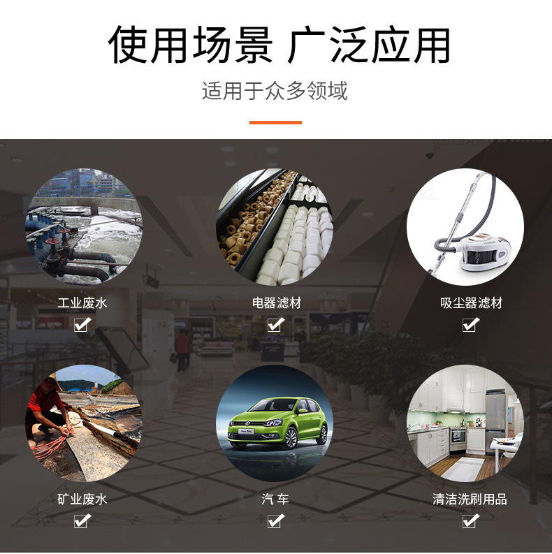 六、过滤海绵产品用途: ①空气净化类:家用空调、空调、空调扇、空气净化器、空气清新机、油烟机、加湿器、、吸烟仪、烟雾塔、净化车间、实验室、洁净棚等。 ②防尘类:机箱机柜、排风扇、吸尘器、冰箱、冷柜机、音箱、电视机、灯具、像机、投影机、手机、暖风机、新风设备、矿采凿岩石设备、冶炼制造等。 ③水过滤类:水族箱、水泵、鱼池、泳池、净水器、洗衣机、水龙头、化装乳液、药水、医药液器、工业药水及污水等。 ④油过滤类:油烟机、汽摩、油箱、油泵、油嘴、油船、工业机器设备等。 ⑤清洁类:洁面、沐浴、厨具、家具、汽车、地板、野炊烧烤用具等。