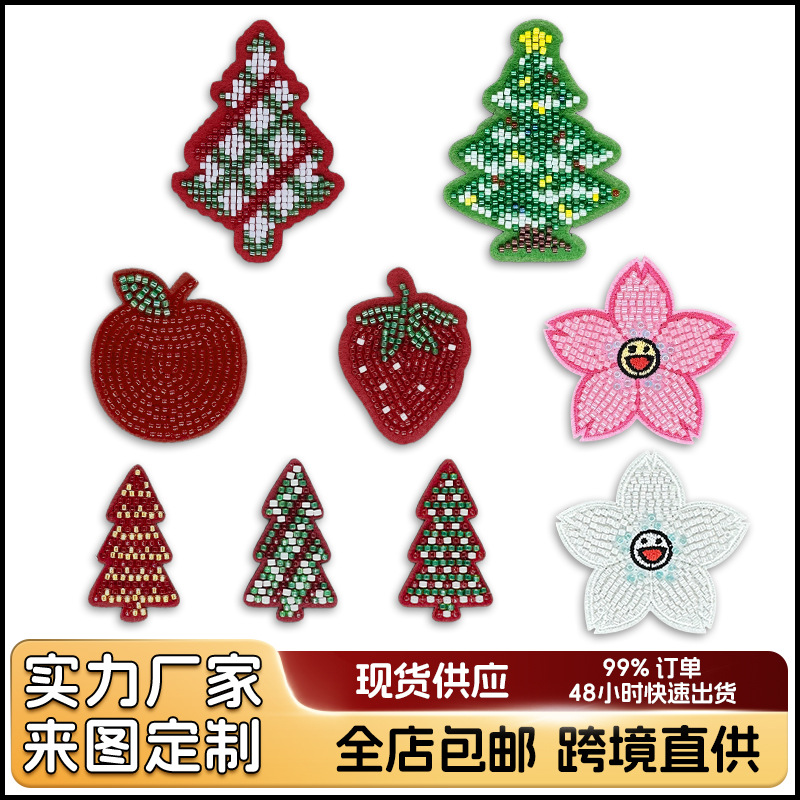 圣诞风圆珠绣立体刺绣布贴 圣诞树苹果草莓花朵补丁 跨境服装辅料