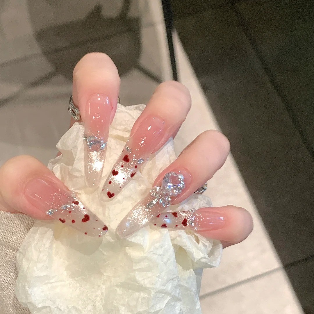 纯手工穿戴甲气质冰透氛围感纯欲风ins贴钻爆闪法式爱心猫眼美甲